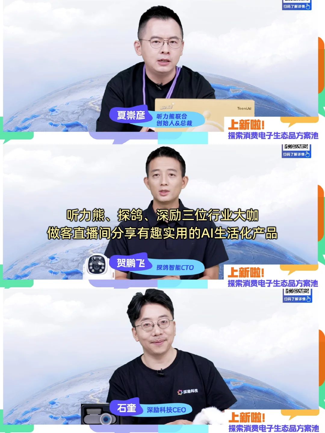 直播里邀请了三家超有实力的厂商大佬:做 AI 智能玩具的听力熊、搞安防摄像头的探鸽,还有专研 AI 语音交互的深励。