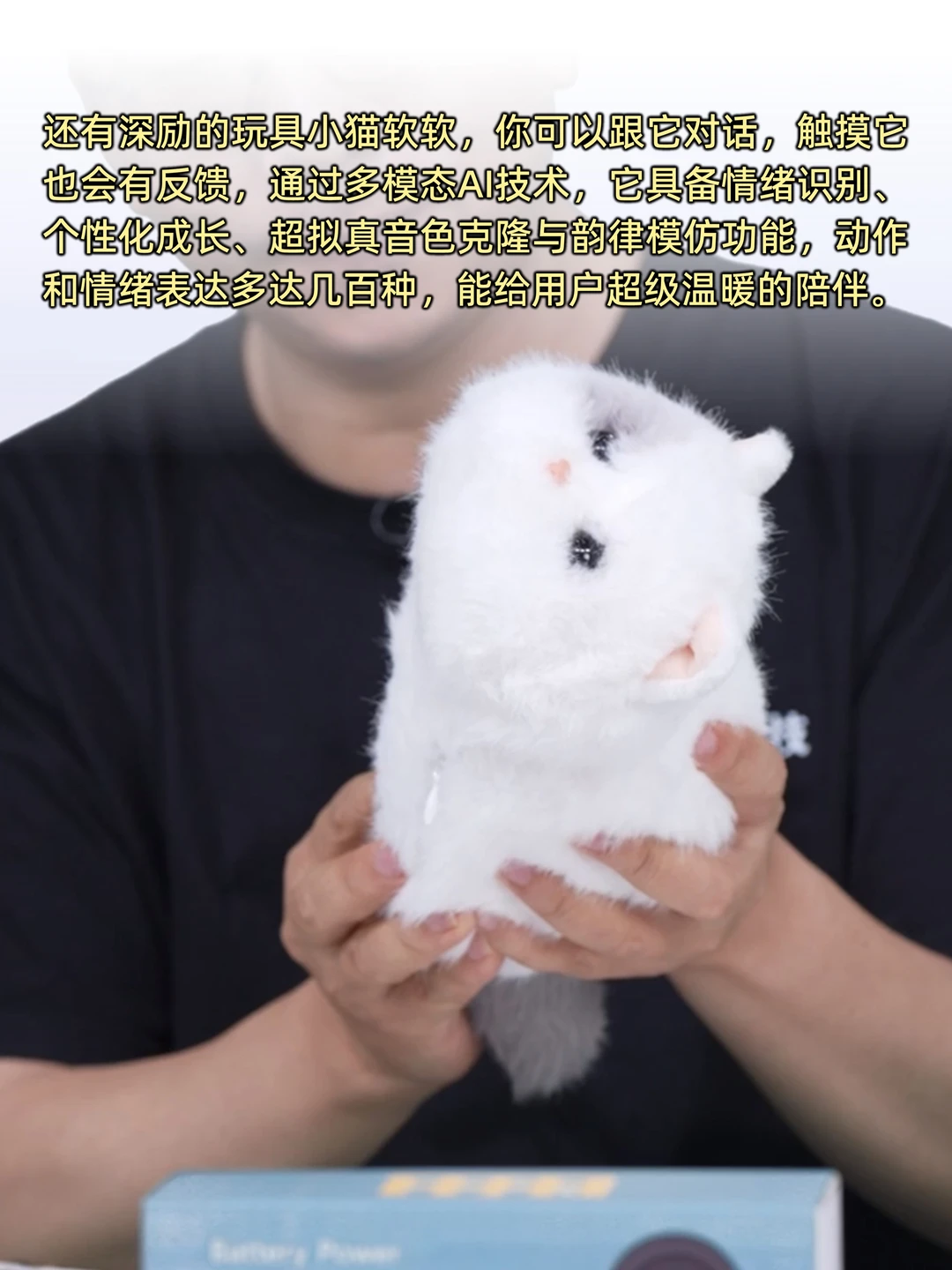 最后是玩具小猫软软,你可以跟它对话,触摸它也会有反馈,通过多模态AI技术,它具备情绪识别、个性化成长、超拟真音色克隆与韵律模仿功能,动作和情绪表达多达几百种,能给用户超级温暖的陪伴。