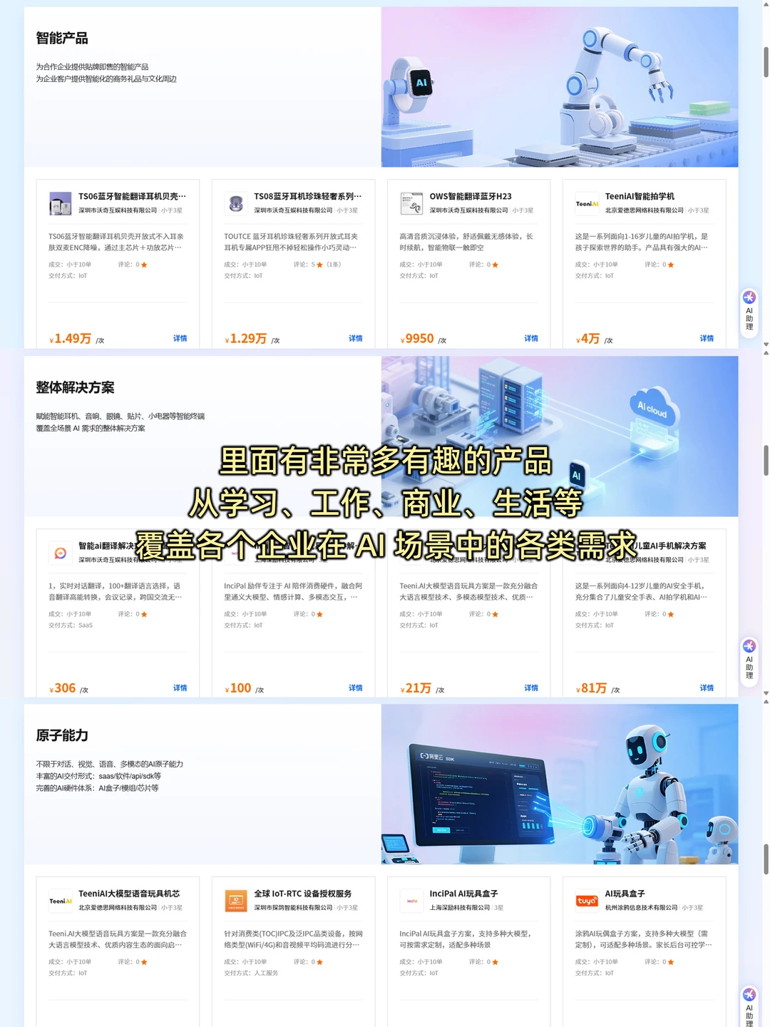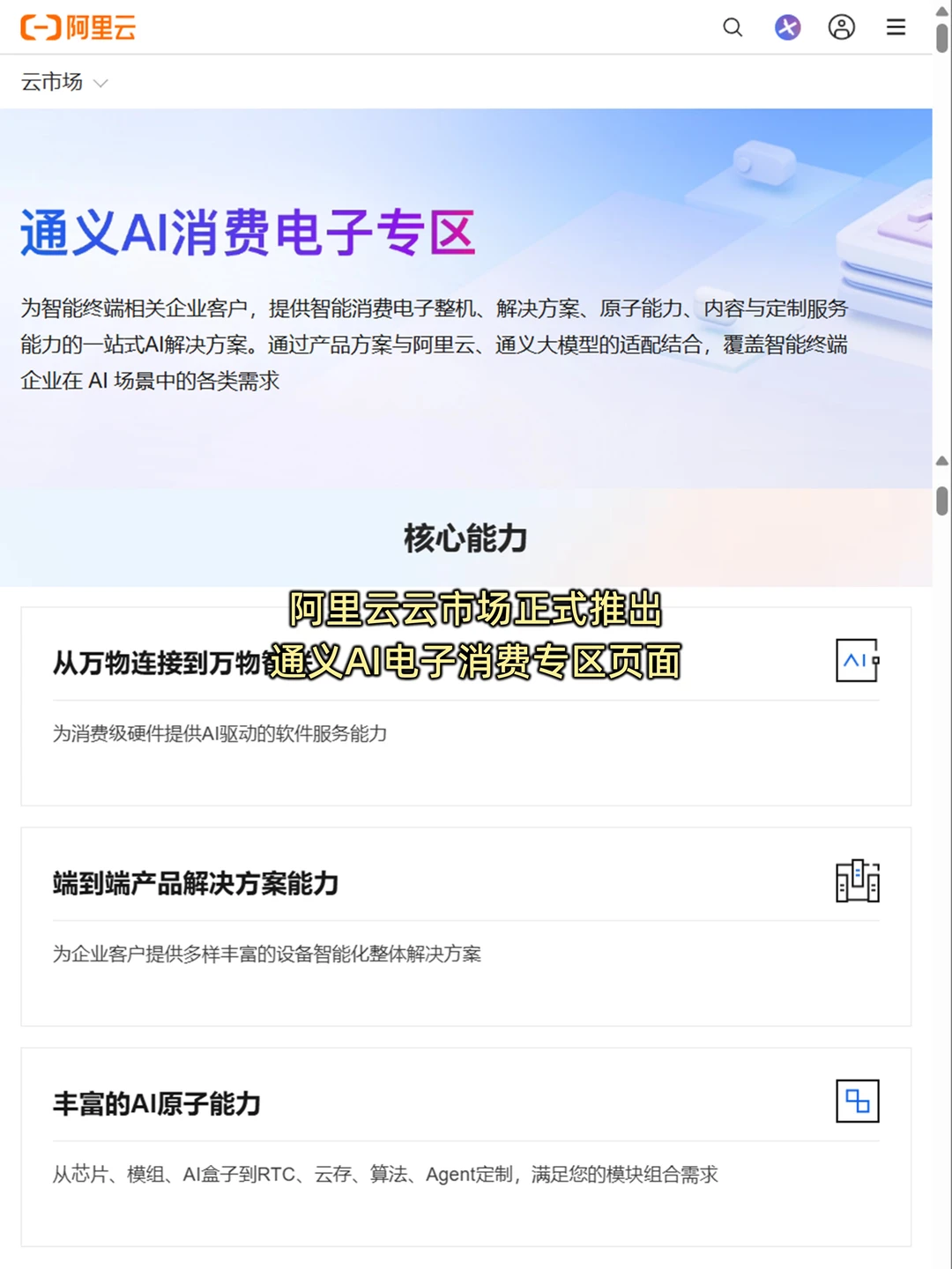 其实看完最大的感受是,AI 早就不是遥不可及的概念了。以前觉得 AI 是工具,现在才发现它慢慢变成了智能伙伴。在阿里云云市场的通义 AI 消费电子专区,还能看到更多有趣的产品,涵盖了从工业级到消费级各场景的产品,不管是电子整机、解决方案,还是原子能力,一应俱全。