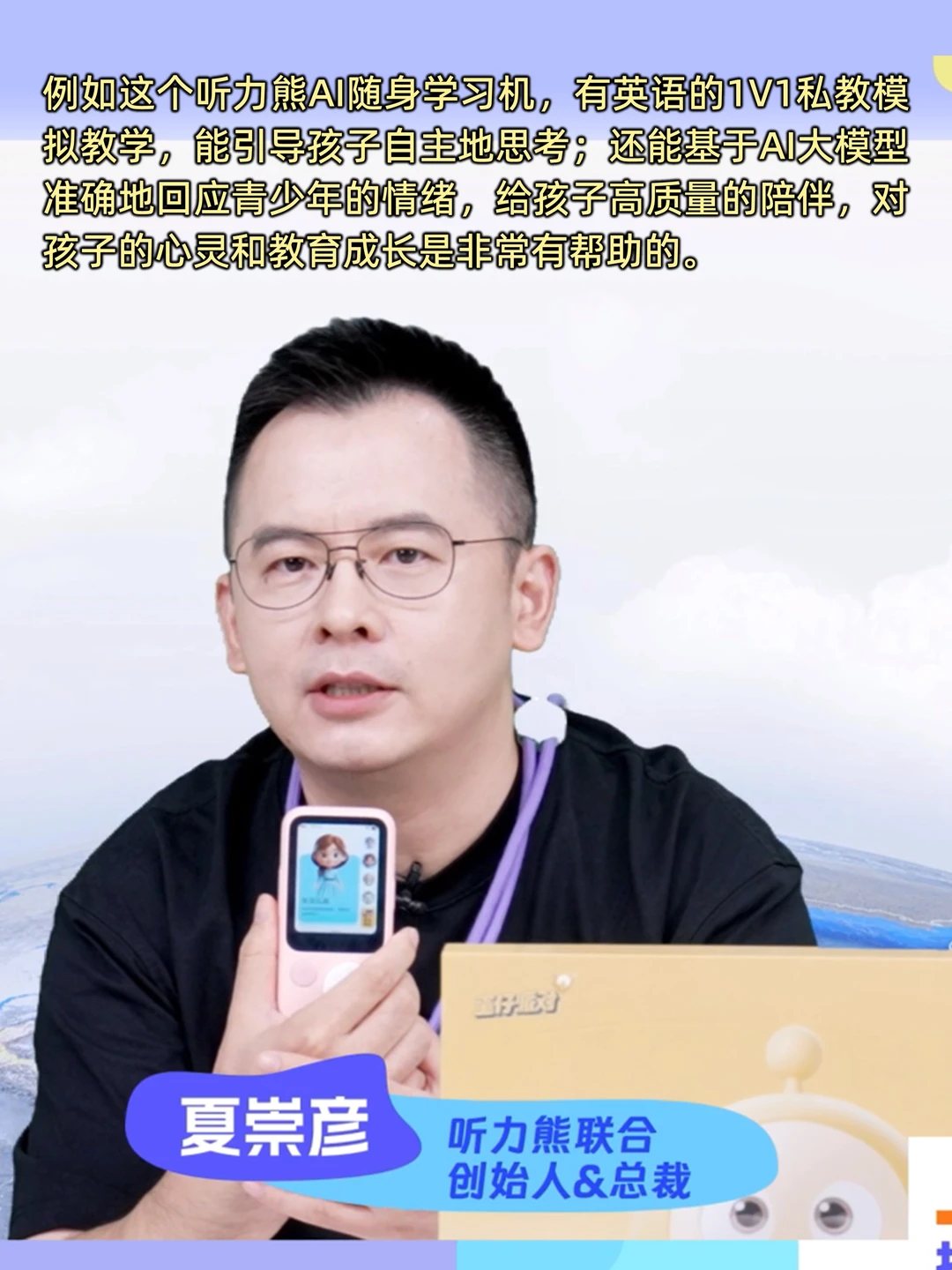 听力熊,它就像一个升级版的学习机一样,有英语的1V1私教模拟教学,能够引导孩子自主地思考;它还能基于AI大模型准确地回应青少年的情绪,给孩子高质量的陪伴,对孩子的心灵和教育成长是非常有帮助的。