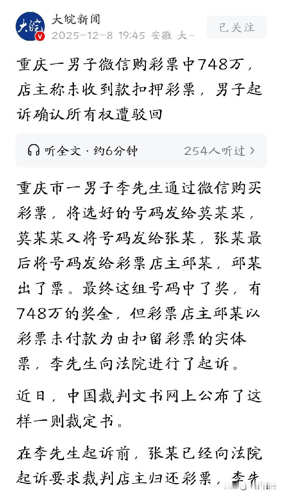 重庆,男子委托朋友帮自己代买彩票,通过微信转了钱,还发去了自己精心挑选的号码。但朋友没有亲力亲为,又将此事委托给了第三人,第三人和彩票店老板是熟人,很快老板出了票,并拍照传给了李某。万万没想到,这张彩票竟然中了748万大奖,男子惊喜的发狂,兴冲冲的跑去兑奖,谁知,老板却以他没付钱为由,拒绝兑换。男子懵了,认为老板是故意为难,想霸占奖金,一纸诉状告上法庭,但法院的判决让人意外。 李先生平日里就爱买买彩票,梦想着哪天能中个大奖,改善生活。 2025年7月31号下午14时23分,李先生通过微信联系上朋友莫某,委托他帮忙代买一张彩票,并发去了自己精心挑选的号码。 莫某收到委托后,也没敢耽搁,两分钟后,就把李先生的彩票号码和需求通过微信转给了张某。 张某也很麻溜,在14时27分,把这些信息发给了彩票老板邱某。邱某办事效率很高,很快就按照要求出了票。 出完票,邱某拍了张照,14时30分通过微信把这张彩票照片发给了张某。张某又转发给莫某,莫某在14时42分,把彩票照片发给了李先生。 李先生收到照片时,心里挺激动,仿佛已经看到奖金在向自己招手了。 过了没多久,开奖结果出来了,李先生简直不敢相信自己的眼睛,这组号码居然真的中了,奖金还高达748万。 李先生从没有如此兴奋过,他甚至已经开始规划这笔巨额奖金怎么花,是先买套大房子,还是换辆车。 然而,命运似乎总爱开玩笑,当李先生满心欢喜地准备去领奖时,却遇到了麻烦。 彩票店主邱某竟然以彩票未付款为由,扣留了彩票的实体票。 李先生一下子就懵了,自己明明已经把钱付给莫某了,让莫某代付,这怎么能叫没付钱呢? 他觉得邱某就是在故意刁难他,想独吞这笔奖金,这简直就是明抢。 原来,李先生虽然把钱给了莫某,莫某也交给了中间人张某,但张某和彩票店老板邱某关系很好,没有及时将钱交给邱某。 双方多次协商,邱某态度强硬,无奈之下,李先生向法院提起诉讼,要求确认彩票的所有权归自己所有。 可就在李先生起诉之后,他意外地发现,张某已经先他一步,起诉了彩票店主邱某,要求对方交付彩票。 而且张某还出具了承诺书,说如果他拿到了彩票,会把彩票交给李先生和莫某。 李先生琢磨着,自己的权益和张某、邱某之间的纠纷肯定脱不了干系。 为了能更好地维护自己的权利,他向法院提出诉讼请求,希望能以独立第三人的身份参加张某的诉讼案,同时再次强调确认彩票所有权归他所有。 法庭上,李先生表示,彩票买卖合同自出票完成时就已经成立了,彩票的所有权也应该转移到了自己这里。 虽然购彩款还没直接付到邱某手里,但这只是产生了债权债务关系,并不影响彩票的物权归属,毕竟他已经把钱给了莫某某。 李先生还觉得,张某就是个代购人,他起诉主张彩票所有权根本没有权源基础。 邱某以“未收到彩票款”为由扣留彩票,这分明就是在侵占他的财产。 要是法院判决彩票归张某或者邱某所有,那他的物权可就直接被侵害了,748万多的奖金说不定就打水漂了。 而且争议彩票承兑截止日越来越近,要是逾期了,奖金可就没了。 所以,他觉得自己必须得追加为有独立请求权第三人参加诉讼,这样才能维护自己的合法权益。 《民事诉讼法》第59条规定:对当事人双方的诉讼标的,第三人认为有独立请求权的,有权提起诉讼;其核心是与本诉原被告形成诉讼对抗,且不参加诉讼将直接损害其实体权利 。 本案中,李先生说自己是通过莫某某向张某买彩票,张某再通过邱某买彩票,可张某已经起诉邱某交付彩票,还承诺要是胜诉拿到票,会把彩票交给莫某某、李先生等人。 这就说明,张某和李先生的利益是一致的,不存在对抗性。 另一方面,按照李先生说的彩票购买过程,在张某和邱某没发生纠纷的时候,彩票的正常交付顺序也应该是邱某先交给张某,张某再交给莫某,最后莫某交给李先生。 现在张某已经起诉要求邱某交付彩票,还承诺拿到票后会交给李先生,所以李先生以有独立请求权第三人参与诉讼根本没有必要。 此外,要是李先生说的彩票购买过程是真的,那李先生对案涉彩票只是依据合同享有交付彩票的债权请求权,在没拿到票的时候,他并不享有物权,所以他对案涉彩票没有独立的请求权。 综上,一审法院认为李先生不符合提起有独立请求权第三人参加之诉的条件,对他的起诉不予受理。 李先生接到一审判决后,心里很憋屈,再次提起上诉。 二审法院经过审理,维持原判。 李先生这下彻底失望了,他怎么也没想到,自己中了个大奖,最后却拿不到手,看得见吃不着,太闹心了。