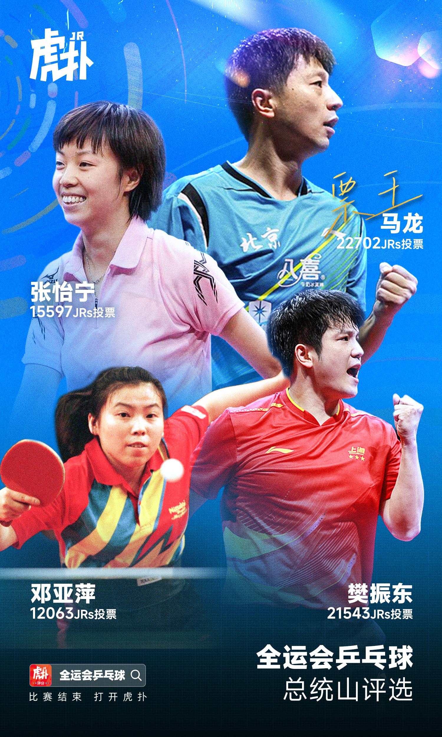 十五运乒乓球比赛收官后,虎扑上线了,邀请全体JRs们评选出大家心中的全运Goat。经历两周的激烈投票竞选,我们统计了大家的评选结果: