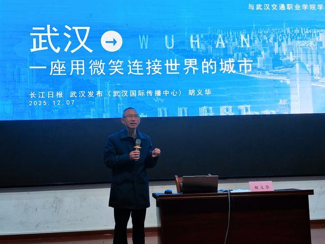 12月7日下午,由武汉交通职业学院交通文旅学院举办的长江文化系列讲座正式拉开帷幕。讲座特邀长江日报高级记者、武汉发布(武汉国际传播中心)新闻责任人胡义华,以《武汉,用微笑连接世界》为题,为现场师生带来了一场聚焦长江生态保护与国际传播的深度分享。学院领导、师生代表近百人聆听讲座。