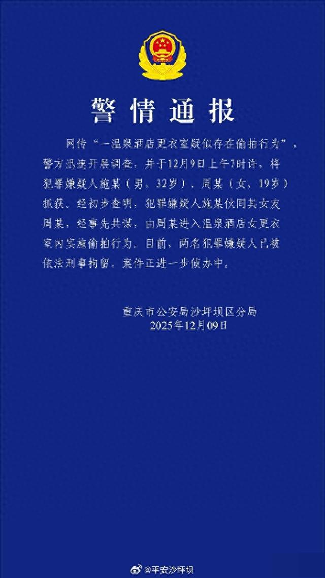 网传“一温泉酒店更衣室疑似存在偷拍行为”,警方迅速开展调查,并于12月9日上午7时许,将犯罪嫌疑人施某(男,32岁)、周某(女,19岁)抓获。经初步查明,犯罪嫌疑人施某伙同其女友周某,经事先共谋,由周某进入温泉酒店女更衣室内实施偷拍行为。目前,两名犯罪嫌疑人已被依法刑事拘留,案件正进一步侦办中。