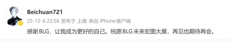 在BLG官宣打野Beichuan离队后,Beichuan转发离队消息:"感谢BLG,让我成为更好的自己。祝愿BLG未来宏图大展,再见也期待再会。"对很多中下游选手来说,自己的梦想并不是s赛奖杯,而是一座银龙杯,能拿个冠军去次世界赛才能说自己真当过职业,北川也算圆梦了,未来祝好Beichuan!BLG官宣Beichuan离队2025lpl转会期英雄联盟