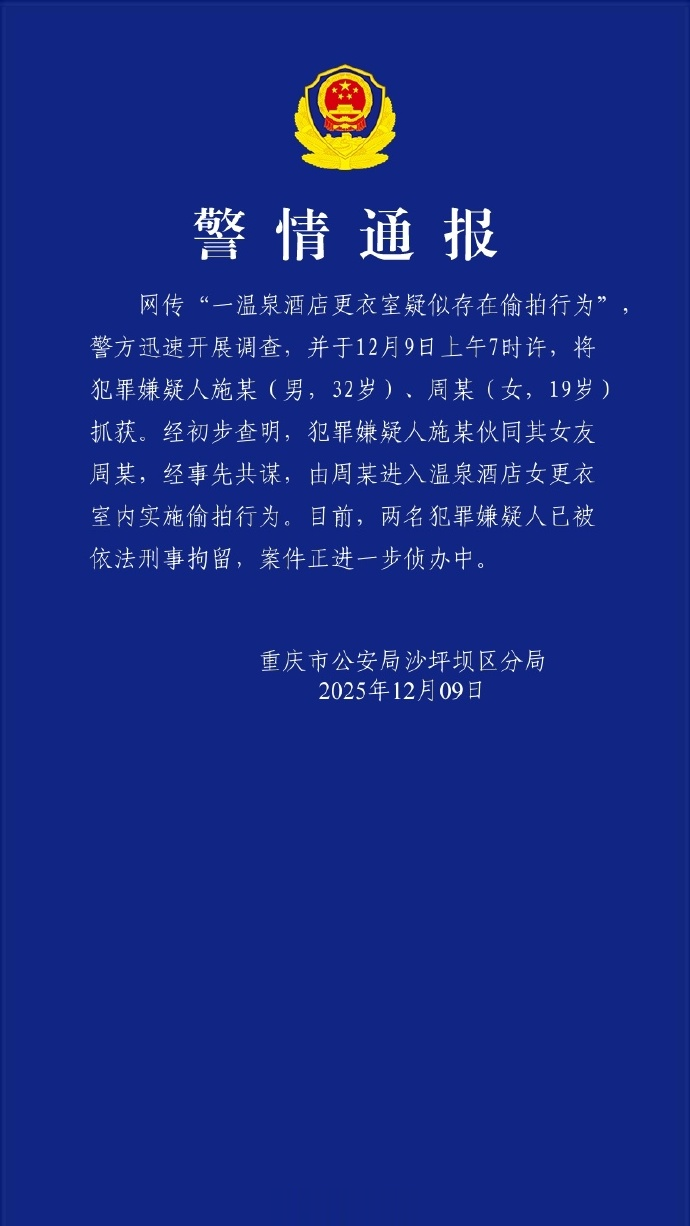 网传“一温泉酒店更衣室疑似存在偷拍行为”,警方迅速开展调查,并于12月9日上午7时许,将犯罪嫌疑人施某(男,32岁)、周某(女,19岁)抓获。经初步查明,犯罪嫌疑人施某伙同其女友周某,经事先共谋,由周某进入温泉酒店女更衣室内实施偷拍行为。目前,两名犯罪嫌疑人已被依法刑事拘留,案件正进一步侦办中。