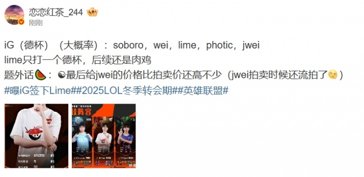 直播吧12月9日讯今日,爆料人“恋恋红茶”更博透露iG新赛季阵容:soboro,wei,lime,photic,jwei!lime只打一个德杯,后续还是肉鸡