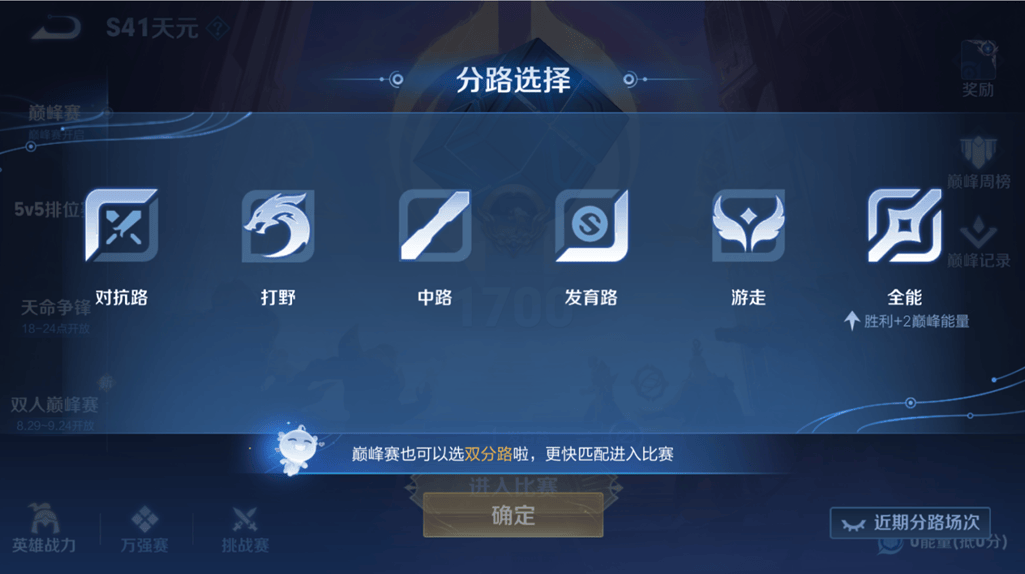 巅峰赛分路选择升级为[自由分路模式],玩家可自主选择主玩分路或主次分路进入匹配。