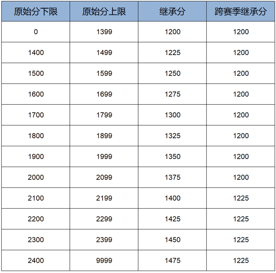 玩家老赛季五条分路中最高巅峰积分将会作为新赛季继承前的原始分。同时,为避免继承过程带来的沮丧感,在本次调整中我们去除了继承到低于1200的情况,鼓励玩家们在新版巅峰赛中能够重新开始。