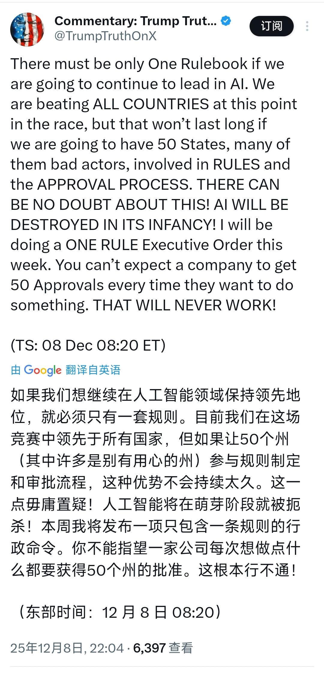 美国总统特朗普12月8日晚发文写道:如果我们想继续在人工智能领域保持领先地位,就必须只有一套规则。目前我们在这场竞赛中领先于所有国家,但如果让50个州(其中许多是别有用心的州)参与规则制定和审批流程,这种优势不会持续太久。 特朗普这番话看似是在敲打“不听话”的州政府,实则戳中了美国AI产业当下最头疼的痛点,所谓“50个州各搞一套”的乱象,早已让科技企业苦不堪言。 2025年10月加州刚签署完自己的AI安全法案,要求企业公开安全协议、15天内报告重大安全事故,违规一次就罚100万美元,而德州那边却在忙着给AI企业松绑,恨不得取消所有不必要的审查,就这两个州的规则差异,就能让一家跨州经营的AI公司忙得晕头转向。 更别说纽约州对AI数据隐私的要求细到离谱,科罗拉多州又侧重算法公平性,50个州50套标准,企业光是组建合规团队解读这些规则,就得花掉不少研发经费。 OpenAI的萨姆・奥特曼算是最有发言权的,2023年他还在国会呼吁加强监管,到了2025年5月的参议院听证会上,态度来了个180度大转弯,直言遵守50套不同法规根本不现实,甚至说任何拖慢行业步伐的监管都是“灾难性的”。 这背后不是他变心了,而是企业真的扛不住了,要知道,现在一家中等规模的美国AI公司,每年花在跨州合规上的费用就得几百万美元,占研发预算的近两成,这些钱本可以用来升级模型、招揽人才,结果全砸在了和各州监管部门的沟通上。 微软副董事长布拉德・史密斯也在听证会上吐槽,美国要赢AI竞赛,不光要砸钱建数据中心、培养人才,更得先把规则理顺,不然再好的技术也会被繁琐的审批绊住脚。 特朗普说美国在AI领域领先所有国家,这话还真不是吹牛,有数据摆在那。 全球AI市场规模预计2030年能突破1.5万亿美元,而2025年的统计显示,美国AI企业占据了全球近六成的市场份额,OpenAI一家就拿下了150多家世界500强客户,从摩根士丹利到可口可乐,都在靠它的技术优化业务。 中国的Deepseek虽然在自动驾驶、医疗影像领域追得很猛,欧洲的MistralAI也拿到了不少银行订单,但论整体技术成熟度和商业化速度,美国确实还握着优势。 可这优势能不能保住,真就像特朗普说的那样,要看规则怎么定。 欧盟就是个现成的例子,他们搞的《人工智能法案》条款繁琐,光高风险AI系统的界定就写了几十页,导致企业合规成本直接增加了17%,未来五年预计要损失300多亿欧元,现在欧洲在全球AI创业投资中只占6%,远远落后于美国,这就是特朗普最不想看到的结局。 美国联邦政府在AI监管上的缺位早就不是秘密了,2025年都快过完了,全国统一的监管框架还没影,只能看着各州各自填补真空。 共和党议员之前想过禁止各州十年内自行监管AI,结果没能通过,这就让局面更混乱了。 有的州想靠严格监管抢占道德高地,有的州想靠放松管制吸引企业入驻,各自的小算盘打得噼啪响,哪里还顾得上国家层面的全球竞赛。 这种情况下,企业的创新热情很容易被消磨,比如一家专注于生成式AI的初创公司,本来想用新模型优化内容创作,结果在加州要符合数据安全要求,在纽约要做算法公平性测试,在德州又得提交商业用途说明,等所有审批下来,竞品早就抢占市场了,这不就是特朗普说的“AI在萌芽阶段就被扼杀”吗? 特朗普向来喜欢简单粗暴的解决方案,这次要搞“只包含一条规则的行政命令”,完全符合他的行事风格。 结合2025年5月参议院听证会上克鲁兹等共和党议员倡导的“轻监管”思路,这条规则大概率是要确立联邦政府在AI监管上的绝对主导权,让企业只需遵守一套全国统一的标准,不用再应付50个州的层层审批。 毕竟现在美国AI产业的核心诉求就是“松绑”,OpenAI、微软这些巨头都在喊“跑得更快”,他们需要的不是面面俱到的监管,而是清晰、稳定、不拖后腿的规则。 再想想全球竞争的大背景,中国有《生成式人工智能服务管理暂行办法》,欧盟有《人工智能法案》,都是全国或全区域统一的规则,企业可以放心投入研发,不用纠结合规问题。 而美国如果还陷在州级监管的内耗里,再好的技术积累也会慢慢被赶超。 特朗普显然看清了这一点,他知道现在不是纠结监管细节的时候,先把规则统一起来,让企业能轻装上阵,保住领先地位才是重中之重。 至于这条规则具体内容是什么,媒体的好奇也不是没道理,毕竟它很可能决定未来几年美国AI产业的走向,甚至影响全球AI竞争的格局。 毕竟在这场技术竞赛里,时间就是金钱,效率就是生命,50个州各自为政的内耗,美国真的耗不起了。