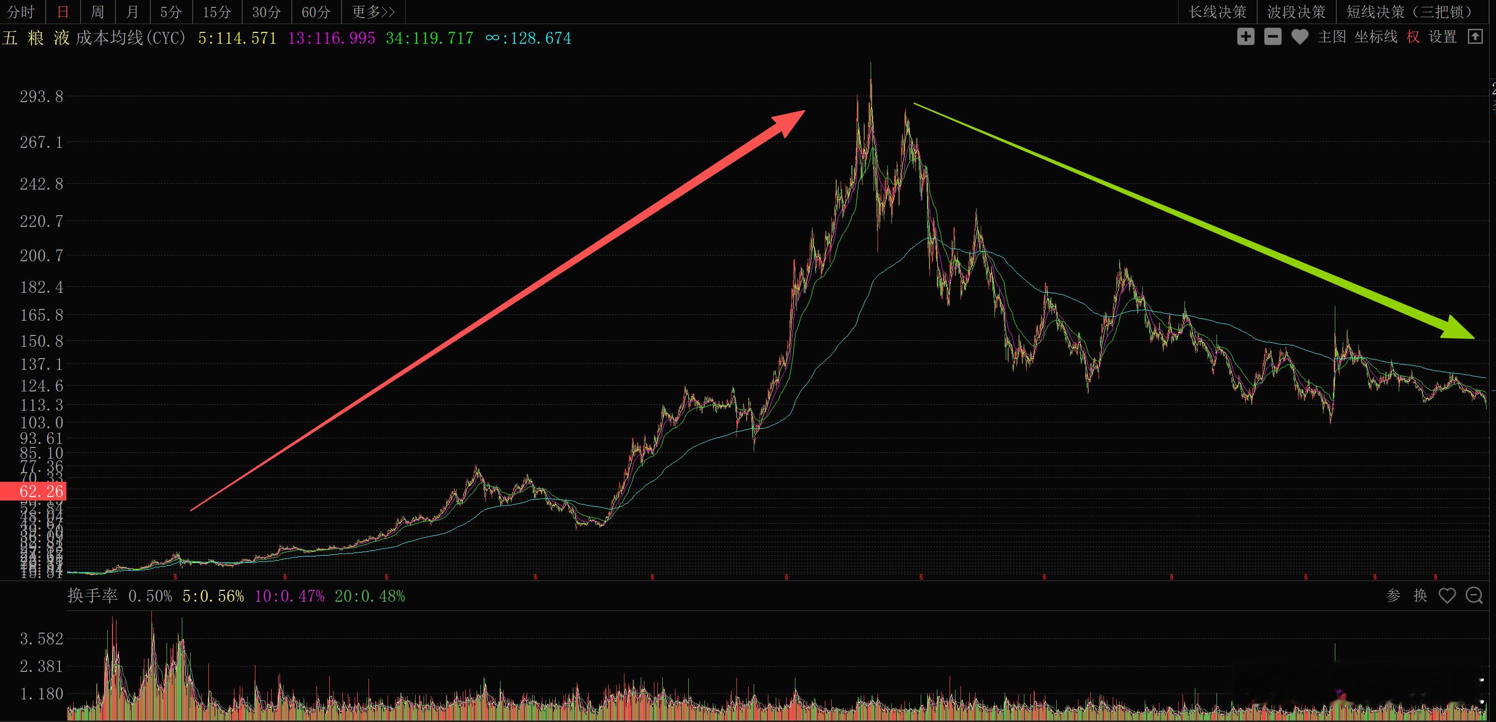 五粮液股价持续下滑。深套里面的人,说把股票留给儿子留给孙子,号称价值投资,其实是阿Q精神。分水岭在21年。21年之前,股价走上坡路,持有时间越长,赚的越多,能不畏波动坚守,那才叫价值投资。事实上,走上坡时,很多人始终恐高。21年之后,股价走下坡路,一定要远离,没有反转之前,所有买入都是接飞刀。事实上,走下坡时,很多人觉得跌的便宜了就安全,结果抄底死在半山腰。我们买的股票必须在走上坡路。上坡的股票,越坚守,利润越厚。谁就真正领会了价值投资。