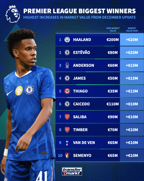 虎扑12月09日讯德国转会市场在今日更新英超球员身价,在球员涨幅方面,哈兰德,埃斯特旺涨2000万欧。