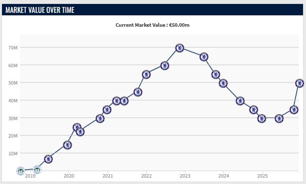 直播吧12月09日讯德转今日更新了英超球员身价,其中切尔西后卫里斯·詹姆斯涨了1500万,现在身价为5000万欧。
