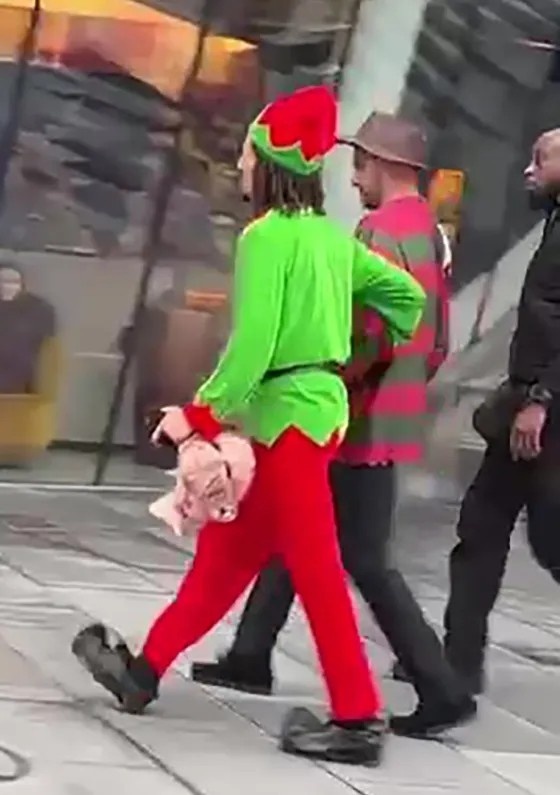 沃克身着经典电影角色弗莱迪·克鲁格服装,被拍到在街头脚步不稳,需要由装扮成“精灵”的22岁队友汉尼拔以及一名安保人员共同搀扶,才能返回下榻酒店。