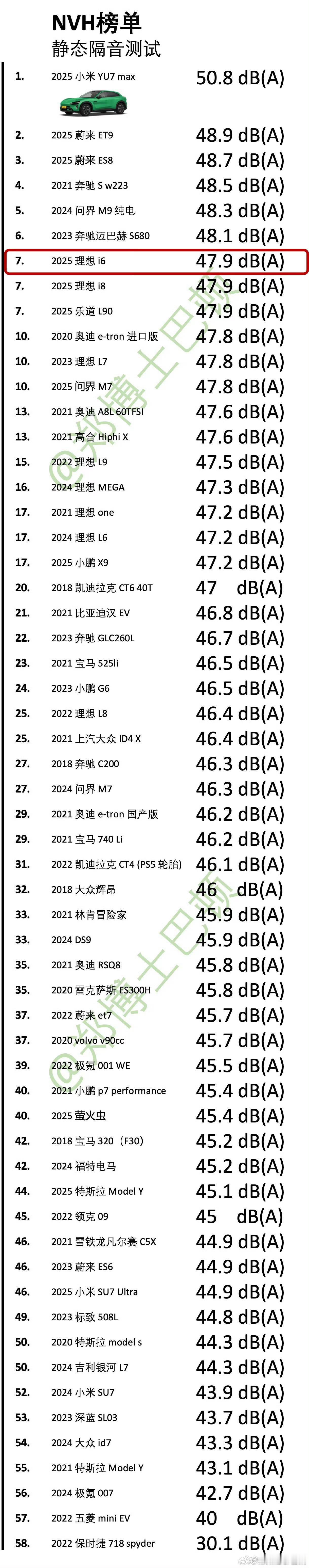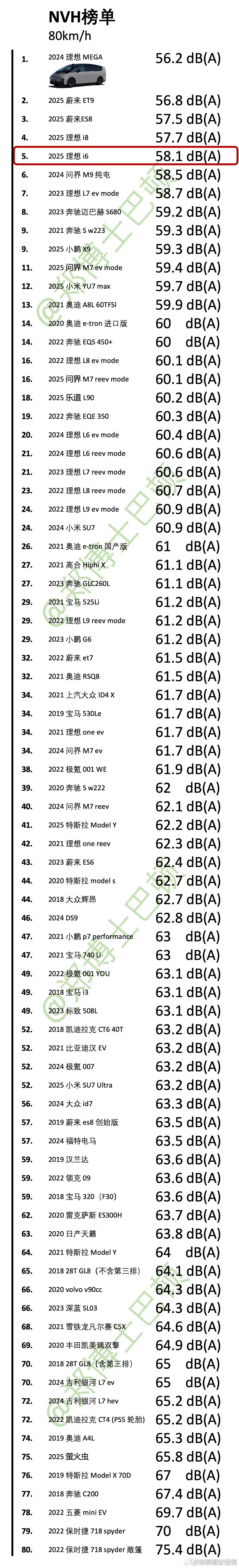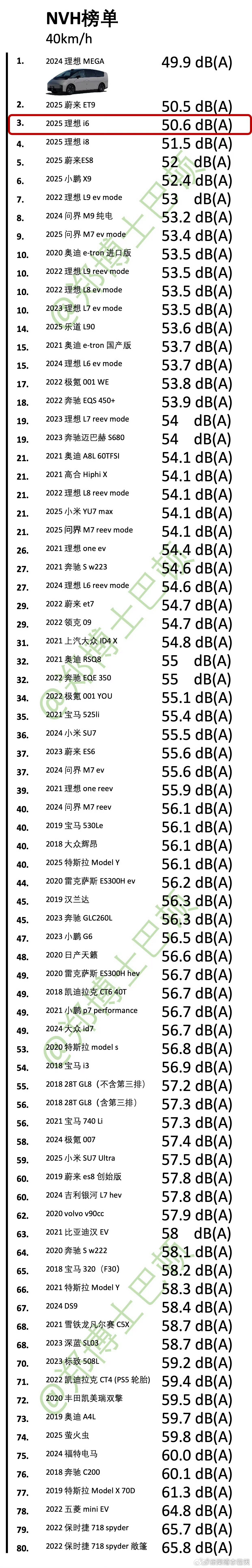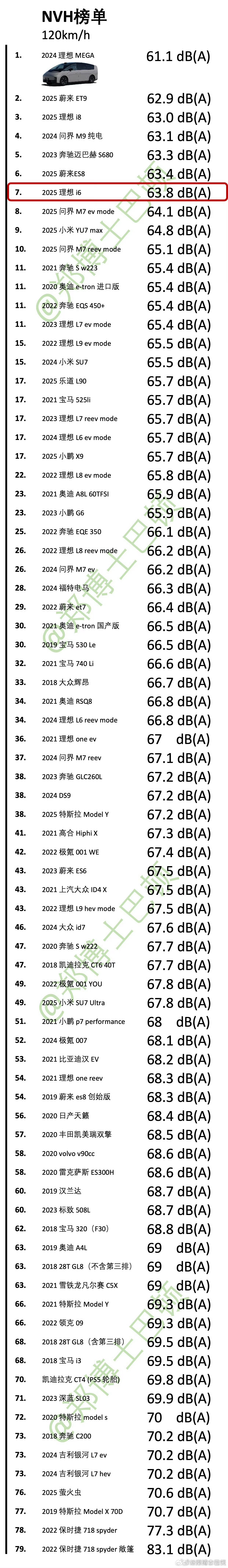 理想 i6 作为一台24万的 SUV,出现在NVH 榜单这个位置,属实有点夸张~
