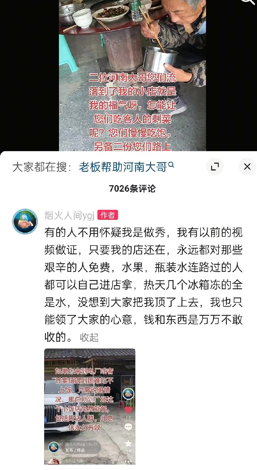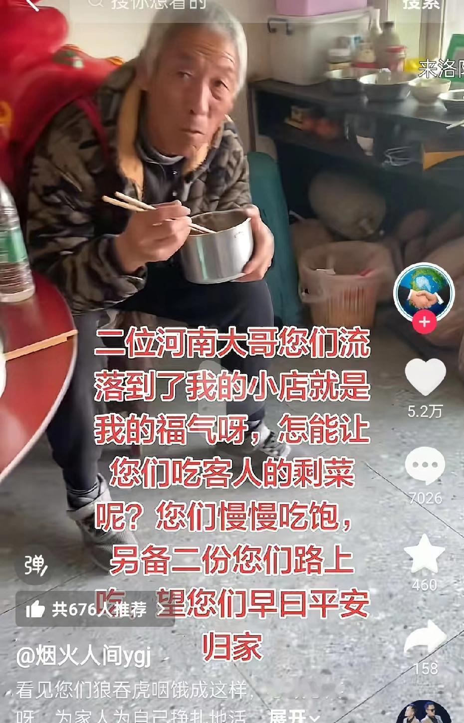这个冬天总有人在看不见的角落温暖你我! 两位河南大叔在贵州可能身上没有钱或者舍不得,去吃别人剩下的饭菜,老板知道后,马上去给他们炒了两个新鲜的菜。 看两位大叔的穿着打扮,一位带着两个啰,另一位背上背着像是鼓,可能走到那里遇上困难了,正好看到别人吃剩的饭菜,想着自己吃了也不浪费。 餐厅老板是个好人,不仅没有赶他们走,还给他们炒了两个干净的菜,又怕他们吃不饱,还一人多做了一份打包,这样的老板真是个大善人。 如果不是碰到困难,谁又原因吃别人剩下的呢? 其实这位老板不是第一次做这种善事,他说只要他的店在,永远会让那些生活艰辛的人免费吃饭,水果和水都可以拿,夏天他冰箱里都是冰水。 这位老板把这个事发到网上后,很多河南网友都说要给他付钱,河南人有情有义,贵州人热情善良,不管到哪里,咱们都是一家人。