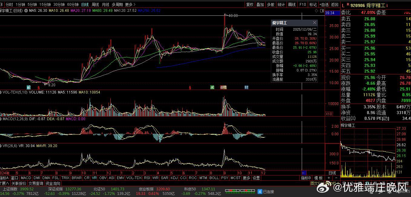 【财富晚茶】今日股市收评:深指跌0.39%:影视震荡回升林业杀跌导语:作者系《网易号》优质财经领域创作者。曾经原创作者和知名网易号旅游领域创作者。大跨度行业等的写作,颇受网友喜爱。作品发表于2025.12.09.15:18优雅端庄晚风。一、视野焦点:恰似“火眼金睛”920906 舜宇精工 盘中-01涨1、突破二年箱底视野盘面:前期双顶:杀跌过度。2025-12-09 截至15:00:股价报收:25.96元。该股上涨-2.48%。成交总量:11126手,成交金额:2920元。总换手率3.35%,最新总市值:38.94亿元。流通市值:38.94亿元。2、精密塑模翘楚主营业务:精密腔注塑模具-汽车内饰功能件研产和销售。公司品牌:汽车功能件-汽车零部件制造商。3、营收净利优秀业绩好转:2025-09-30 三季度报:公司营收:4.9414亿 同比增9.82%。公司净利:3680.2627万 同比增2586.85%。二、空方强势:恰似“弱肉强食”1、博弈追踪盘面第一、沪深盘面透析沪深回放:跌宕起伏。早盘:低开四涨,五跌三涨。午盘:六跌一涨,一跌二涨。尾盘:二跌二涨,次低绿盘。第二、透析沪深指数追寻沪深:跌宕起伏。沪指跌0.37%(014.56点),报03909.52点,成交额07812亿。深指跌0.39%(052.63点),报13277.36点,成交额11228亿。创指涨0.61%(019.33点),报03209.60点,成交额05550亿。北指跌1.72%(024.52点),报01401.73点,成交额00139亿。沪深北市:合计成交:19179亿元。2、复盘沪深个股第一、今日个股视野今日观察:涨跌互动。1308上涨,65个股涨停板。4057股下跌,9跌停板。沪深北市:合计成交19179亿元。三、沪深阴棒:恰似“满天阴霾”1、洞察机构尾盘主旋律:沪深强势,尾盘杀跌。沪指距9:31-15:00:前2小时放量盘升,中1小时略量盘跌,后1小时略量盘升。深指距9:31-15:00:前2小时放量盘升,中1小时略量盘跌,后1小时略量盘升。沪深两市:合计成交:19179亿元。四、资金流向:恰似“水落石出”1、目击主力资金Wind统计显示:主力资金今日净流出359.69;其中,创业板主力资净流出136.9亿元;沪深300成份股主力资金净流出75.05亿元;科创板主力资金净流出45.97亿元。所属的31个一级行业,今日有3个行业主力资金呈现净流入,其中,商贸零售主力资金净流入最多,净流入金额为11.43亿元;行业主力资金净流入居前:综合、银行等。28行业主力资金呈现净流出,其中,有色金属主力资金净流出最多,净流出金额为:79.37亿元;行业主力资金净流出靠前:计算机、机械设备、非银金融、电力设备等。2、龙虎榜晴雨表收盘龙虎榜数据:机构席位资金合计:净买入约1.02亿元。其中,净买入的个股15只,净卖出的个股14只。机构净买入最多:德科立,净买入额达1.75亿元;机构净买入居前:通宇通讯、海欣食品等股。机构净卖出最多:雷科防务,净卖出额达1.52亿元;机构净卖出居前:广东宏大、太阳电缆、力星股份等股。3、涨停板跌停板第一、板块涨停上涨板块:元器件、综合类、消费电子、一般零售、通讯设备等。下跌板块:林业、近期复牌、分散染料、工业金属、酒店餐饮等。第二、个股涨跌沪深个股:跌多涨少,空方强势,略胜一筹。其中,1308上涨,65个股涨停板。4057股下跌,9跌停板。沪深北市:合计成交19179亿元。4、明天趋势先知第一、沪指预测12月10日:沪指突破阻力:03923点看涨,前程似锦;跌破支撑位:03902点看跌,日暮途穷。第二、深指预测12月10日:深指突破阻力:13398点看涨,鹏程万里;跌破支撑位:13227点看跌,不堪造就。五、本创作者:恰似“优质网易”投资投机迷茫之中:给予尽可能有帮助:资本市场风险自负。(优雅端庄晚风《网易号》优质财经领域创作者和原创作者; 违者必究)