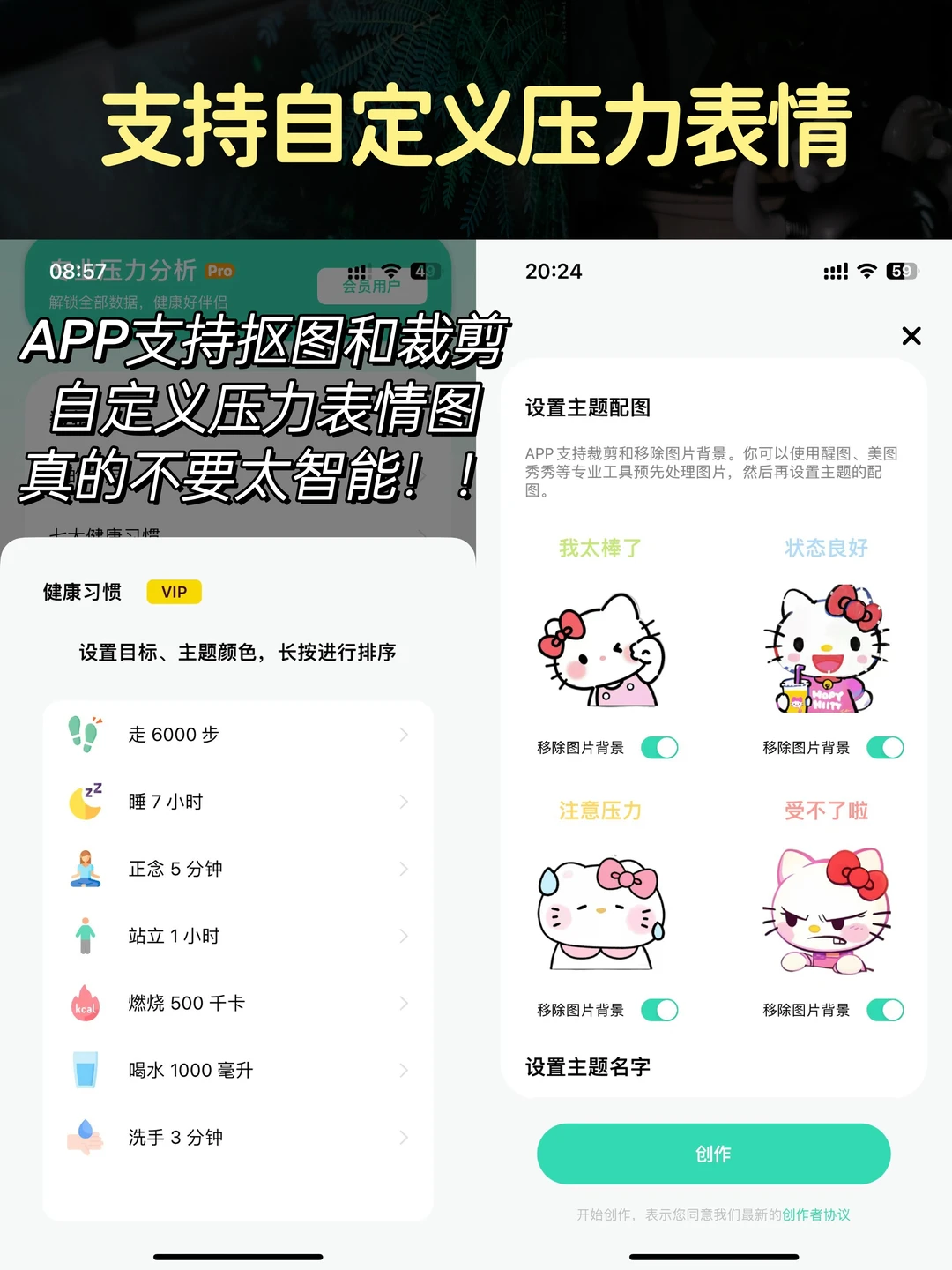 与市面上其他同类产品相比,我最喜欢的就是它的画风和设计,真的超级可爱治愈,还能自定义压力表情,大家可以看我笔记的第4和第5张图,这个Hello kitty是不是非常可爱呢?