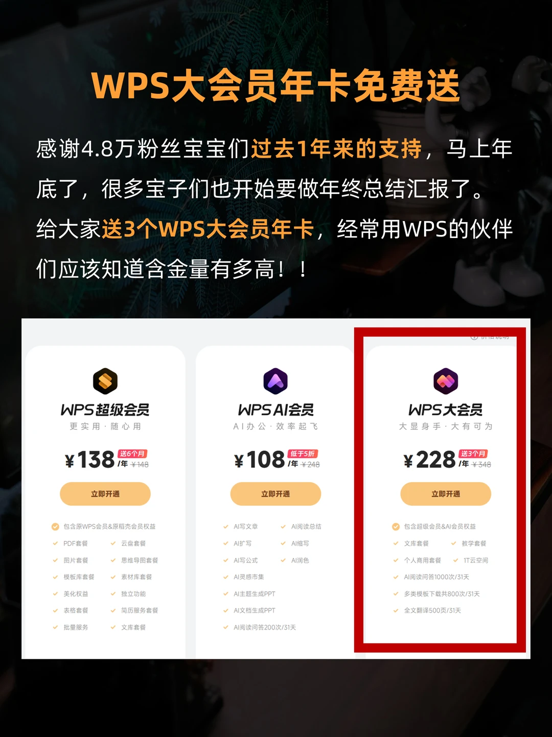感谢4.8W粉丝宝宝们过去1年来的支持,马上年底了,很多宝子们也开始用WPS做年终总结汇报了。 给大家安排了3个WPS大会员年卡,经常用WPS的宝子们应该知道含金量有多高!! 礼物🎁:WPS大会员年卡,3个 开奖时间:2024年12月29日 参与方式:点击左下角“限时抽奖” 现在WPS官方还有年终活动,可以🆓解锁AI生成PPT、AI滤镜、AI风格克隆,精选年终总结PPT模板,宝子们也可以蹲一波~