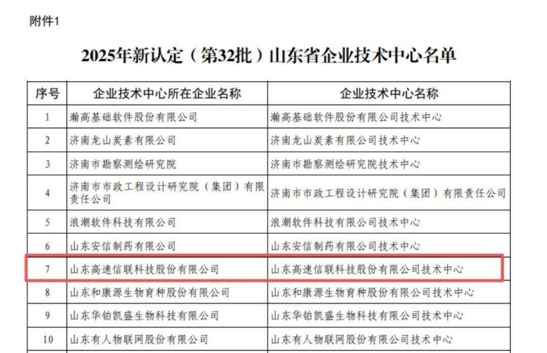 近日,山东省发展和改革委员会发布2025年新认定山东省企业技术中心名单,山东高速集团权属单位信联科技公司成功入选。