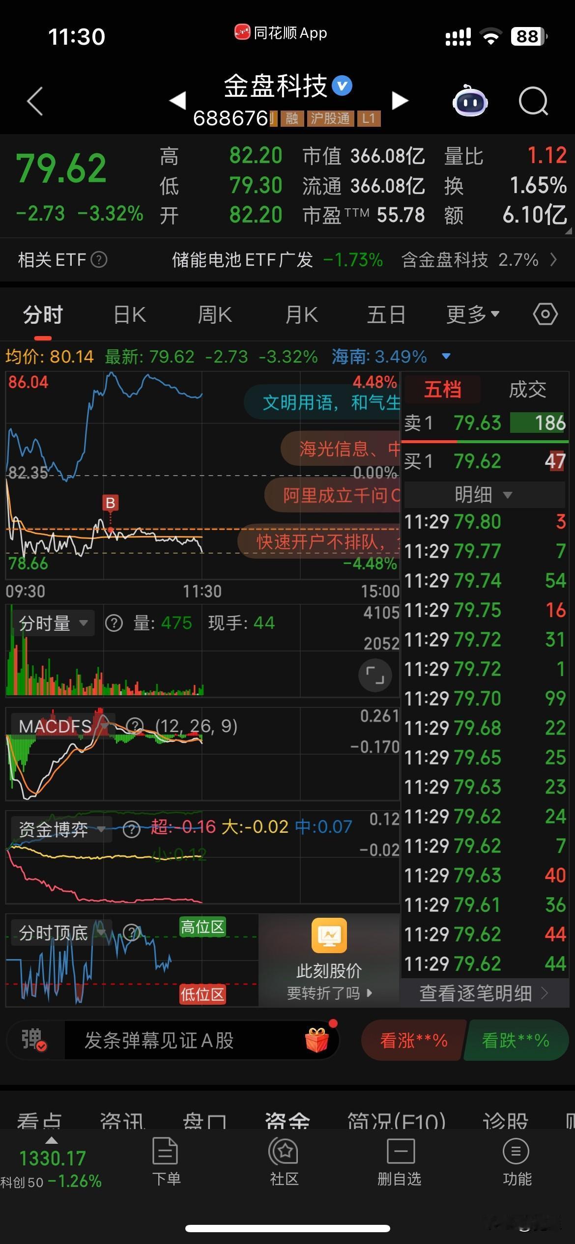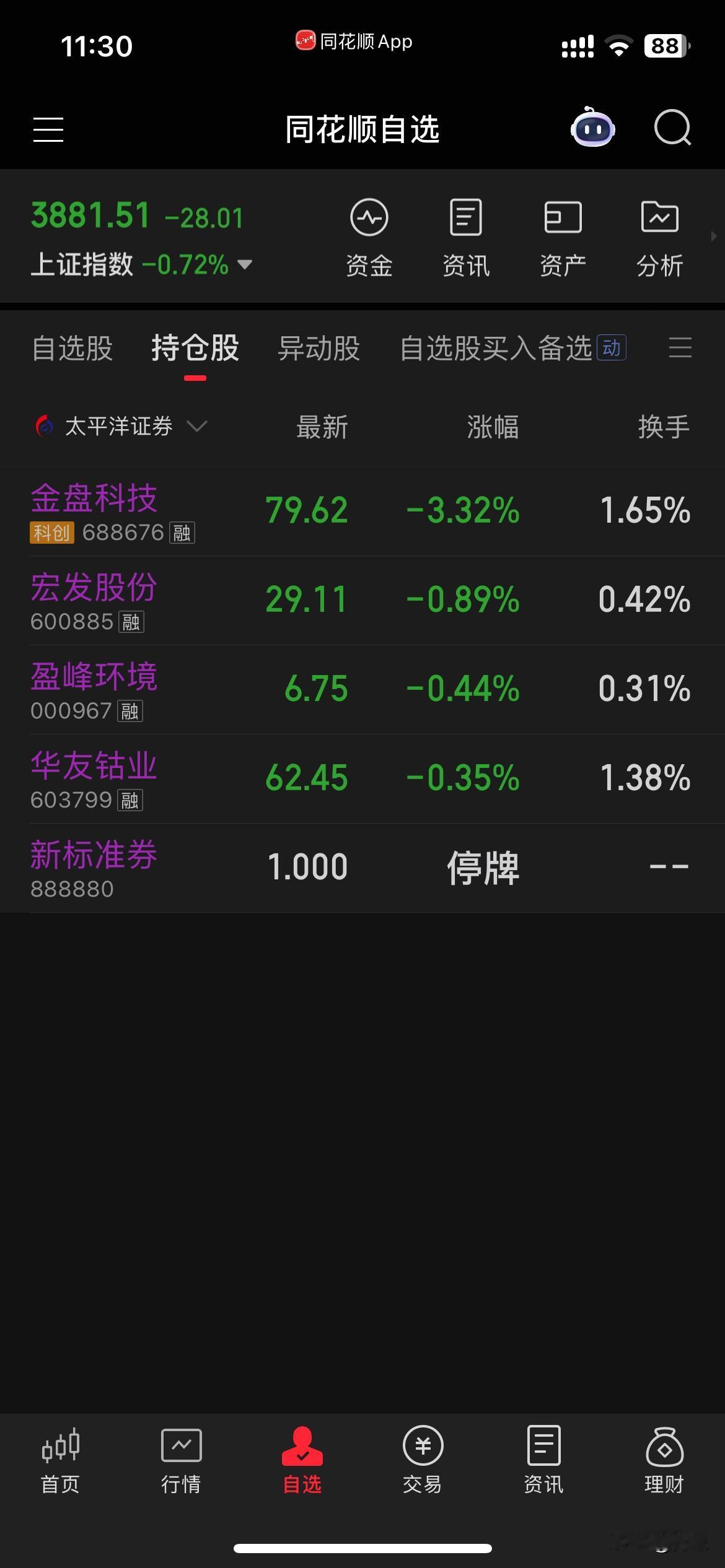 上午大盘延续昨日的弱势一路向下。目前看有止跌企稳迹象,看好下午反弹。早盘海南板块大涨。忍不住加仓了金盘。这货竟然是海南板块倒数第一。希望下午反弹让我做个T。上午亏1千。好在本月还有点利润垫。上午持仓股全绿,好在除了金盘其余跌得不多。