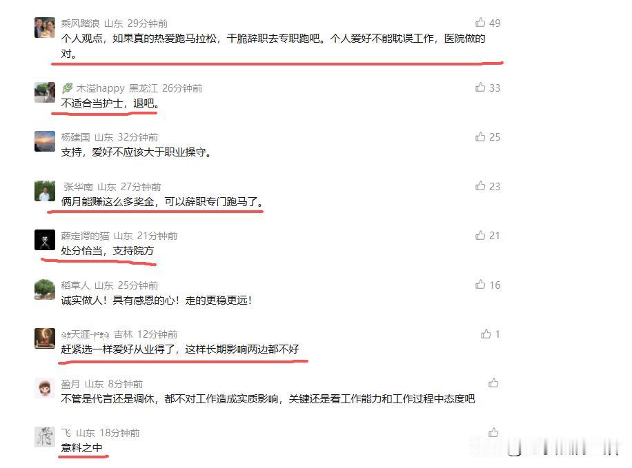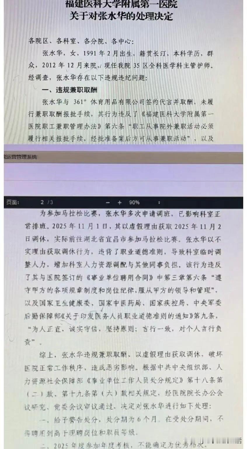 最快女护士被医院警告处罚半年。 这次网友站在医院这边。 当主业也兼职冲突的时候,很多人估计会和张水华一样吧,既不想丢掉本就来之不易的工作,因为这份工作是是她后半生的经济保障。又经不起兼职带来的丰厚奖励,同时还有精神上的荣誉感! 刚刚过去的深圳马拉松比赛,张水华就获得了6000美元的丰厚奖励,这份收入可是很多普通人一年都不一定能挣到的,她却用一场比赛轻松得到。 另外有人统计说,她在近50天的时间里,就赢得了大约20万的各种奖励。这份收入,是她在医院埋头苦干好几年才能挣到的,并且期间还要付出无数的艰辛,遇到各种闹心事。 不过她的高收入和无限风光,却是建立在各种调休和请假的基础上进行的,这也就意味着集体利益要向她的个人利益让步,也是对和她同科室的同事的不公平。 就像网友评论的一样,鱼和熊掌是不可兼得的,要么放下高额奖金的诱惑,回归正常的工作中,一辈子平庸又安稳的度过。 要么就干脆辞职,专职去跑马拉松比赛,利用现在年轻还能跑动,挣够养老钱以后,再去想其他的工作,比如当兔子,或者从事马拉松相关的组织工作等,让自己的特长和爱好,心无旁骛的发光发热。 你觉得医院给她的处分是否恰当? 女护士跑马拉松 护士马拉松