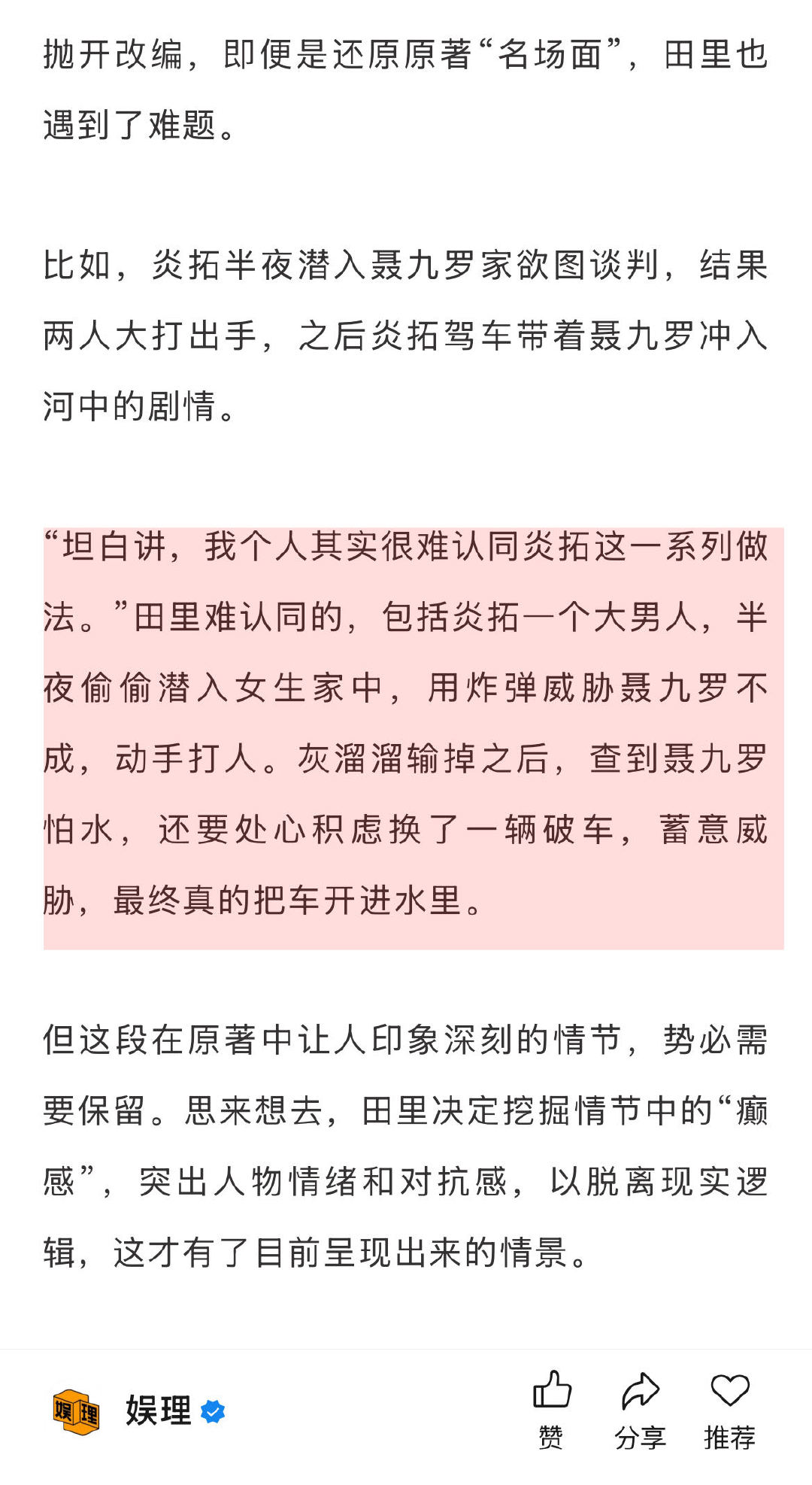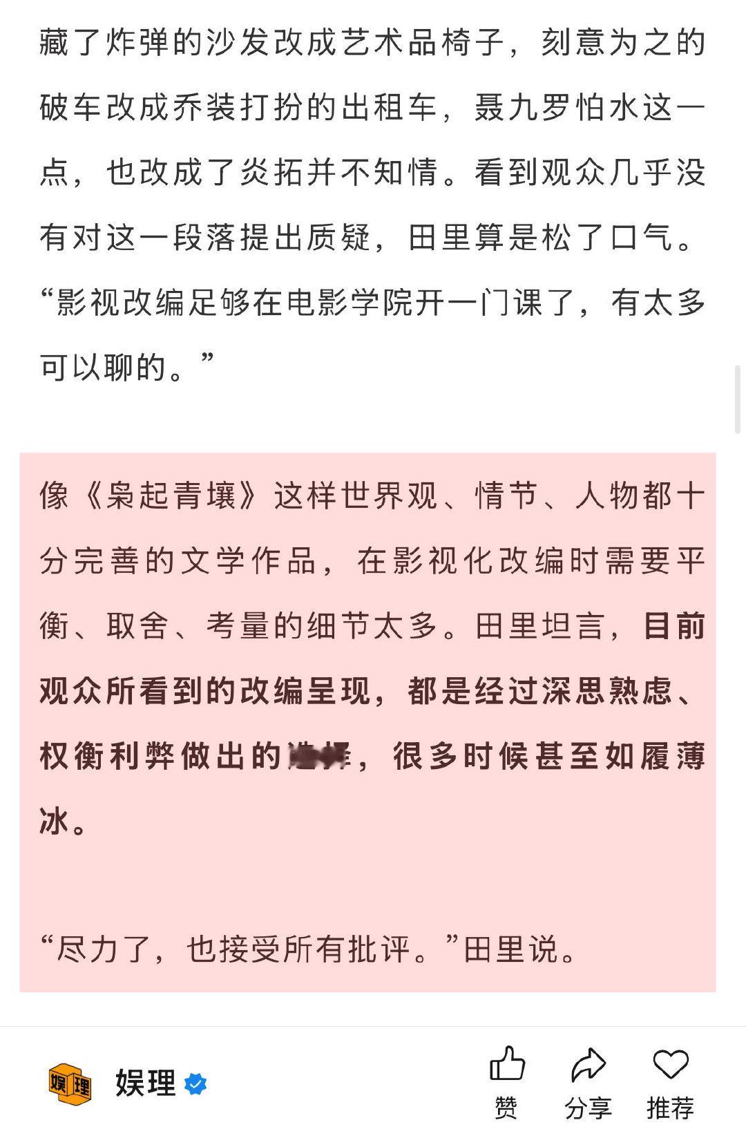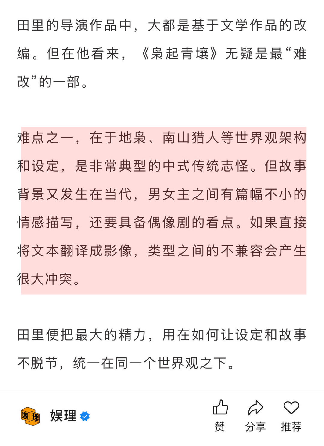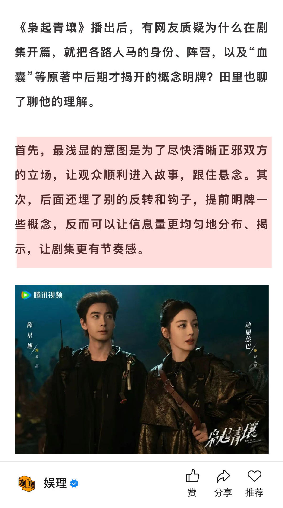 田里说迪丽热巴是导演友好型演员 导演回应枭起青壤美学 像《枭起青壤》这样世界观、情节、人物都十分完善的文学作品,在影视化改编时需要平衡、取舍、考量的细节太多。导演田里向坦言,目前观众所看到的改编呈现,都是经过深思熟虑、权衡利弊做出的选择,很多时候甚至如履薄冰。“尽力了,也接受所有批评。” 娱理独家↓