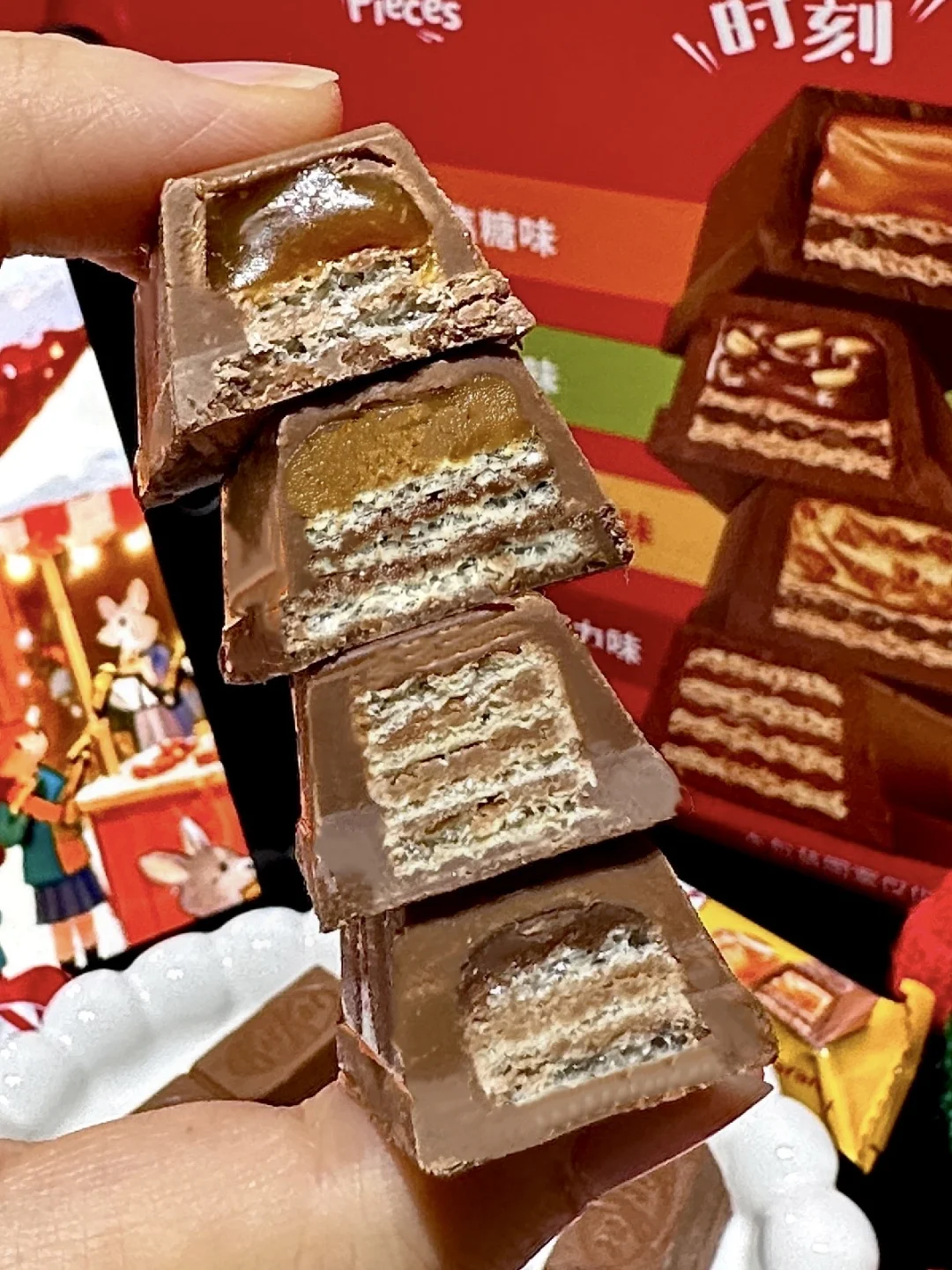 外层丝滑浓郁的牛奶巧克力,里面是三层酥脆威化,混合着四种不同口味的特色酱心!🤤