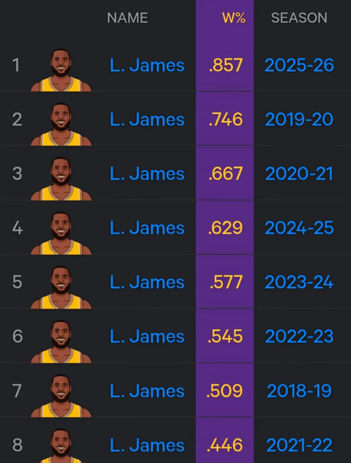 湖媒发推晒出了勒布朗-詹姆斯本赛季出战时的胜率。 詹姆斯本赛季出战7场比赛,战绩6胜1负,胜率为85.7%。 本赛季詹姆斯的胜率暂列湖人单赛季生涯新高,超过了夺冠赛季的胜率。