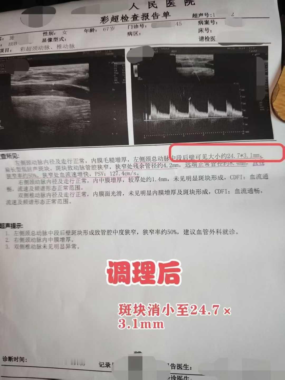 颈动脉斑块从 39×4.6mm 缩小至 24.7×3.1mm!中药远远被低估了 在我的诊室里,常遇到这类颈动脉斑块患者:查出血管斑块后,被头晕头胀、手脚发麻缠扰,既担心斑块破裂引发脑梗,又不愿长期吃西药伤肝肾,更惧怕手术风险,最终抱着尝试心态找上门。 从医多年,我深刻体会到,中医药调理颈动脉斑块的实力远被低估。很多人以为斑块一旦形成就无法消除,只能终身服药控制,但其实在早中期及时介入,通过中药打通气血、清除瘀浊,多数患者能收获明显好转。 56 岁的张女士就是典型案例。半年前她体检发现颈动脉斑块 39×4.6mm,平时总头晕昏沉,转头时眩晕加重,偶尔手脚发麻,夜里也睡不踏实。西医建议长期吃降脂药,可她担心肝肾损伤,一直犹豫,经朋友介绍来找我用中药调理。 我为她诊脉辨证,脉弦涩,舌暗紫、苔白腻,这是痰瘀互结、气血不畅的典型表现。其实颈动脉斑块的本质,就是身体代谢失常,血液中的 “垃圾” 沉淀在血管壁,像水管水垢般越积越厚,既堵塞血管,又导致脑部供血不足,引发头晕等不适。 中医调理从根源入手:一方面化痰祛瘀,清理血管内已形成的瘀浊垃圾;另一方面健脾益气、疏肝理气,增强身体代谢能力,杜绝 “垃圾” 再堆积,让气血顺畅运行。 我根据她的情况,开了化痰祛瘀、益气通脉的方子,用丹参、川芎活血化瘀,茯苓、白术健脾祛湿,天麻、葛根平肝通窍,兼顾缓解头晕。同时叮嘱她清淡饮食、少吃油腻,每天慢走 30 分钟,避免熬夜和情绪激动。 调理三个月后,张女士复诊时欣喜分享:“头晕明显减轻,手脚不麻了,夜里睡得特别香!” 复查颈动脉超声显示,她的斑块从 39×4.6mm 缩小至 24.7×3.1mm,好转十分显著。目前她已继续约诊,坚持调理巩固,力求进一步清理瘀浊、稳定斑块。 很多人好奇中药为何能让斑块缩小?核心就是 “通”—— 打通气血、清除瘀浊,让血管恢复通畅。不仅能缩小斑块,还能改善头晕等不适,无西药的肝肾损伤副作用,也不会产生依赖。 颈动脉斑块不可怕,可怕的是盲目忽视或长期硬扛西药。早中期找对思路,用中药辨证调理,清瘀浊、调脏腑、通气血,就能慢慢逆转斑块、稳定病情,让血管更健康,远离脑梗风险。