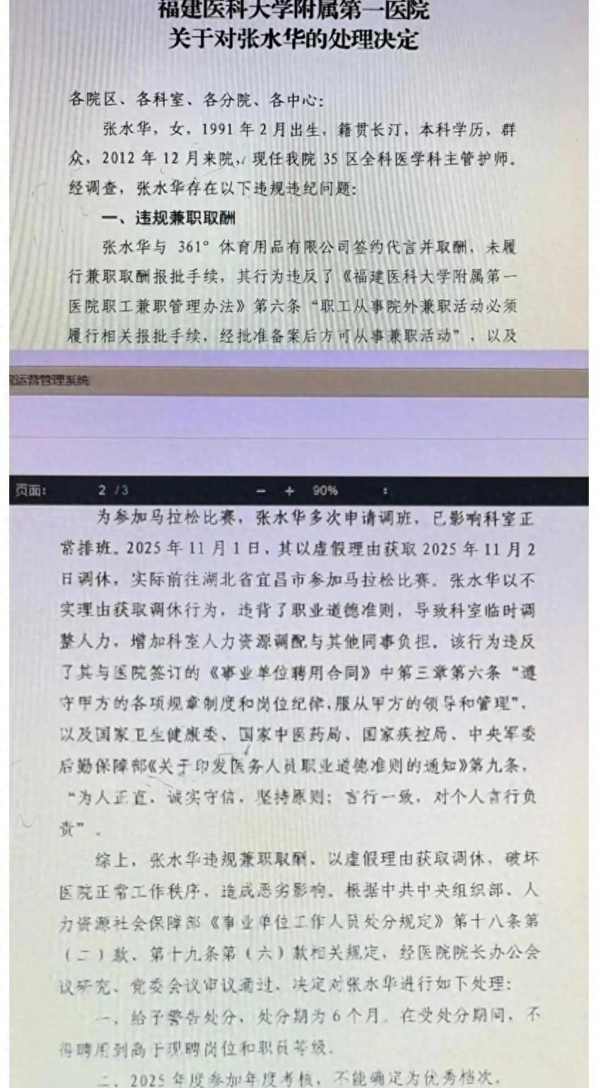 “最快女护士被警告”这事,总结起来就四个字:咎由自取 从最新的通报可以看到,她主要违规的地方是兼职取酬、以虚假理由获得调休,换句话说就是没有跟组织汇报,违规在外面赚取“外快”,然后为了获得调休,编纂了很多虚假的理由,既影响了医院的排班,也影响了其它同事的休息安排,最后自己获得了20万奖金,签了代言,赢得了“最快女护士”的名声,确实做的有些过了。 目前医院给她的处分是警告6个月,不得评优,说白了跟“记大过”差不多吧,自此以后护士生涯增添了一个“污点”,以后哪个医院如果聘用你,都会根据这个进行考量的,一旦在这个医院的合同一到期,估计她的护士生涯也就到头了,毕竟医院是救死扶伤的地方,不是跑马拉松的地方,谁都不敢冒险。 但有一位网友说的很对:“她已经火的一塌糊涂了,开直播、接广告、继续跑,这奖金不比当护士赚的多,最重要的是没有请假的心理负担,主动辞职,给大家都留个体面。” 说实话,如果我的同事是这样,我也不喜欢跟她一个班,毕竟医院都是“一个萝卜一个坑”,有时人手都不够,一个人还要当两个人用,她为了她的爱好牺牲我们的时间,谁会高兴,但事也不是绝对的,如果她有“爱分享”的心,或许大家还能照顾照顾她的,这就是人性。