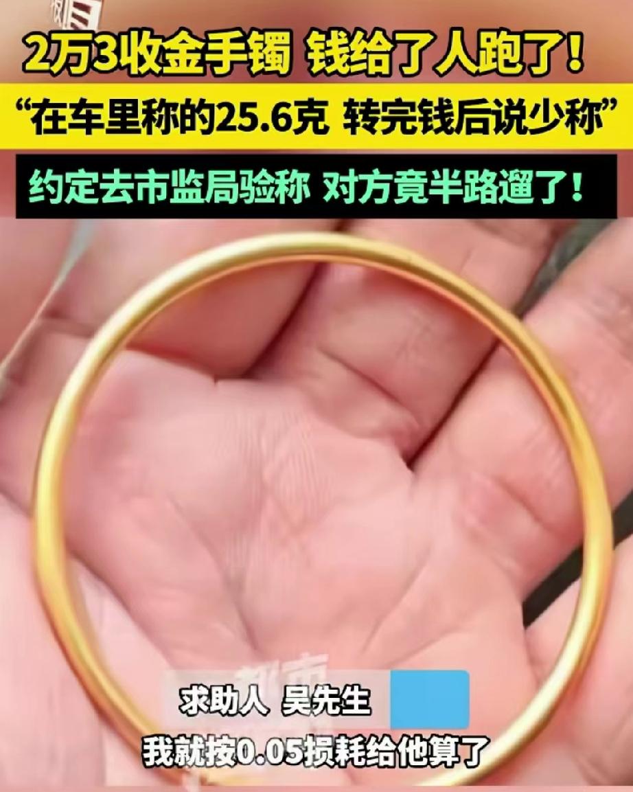 河南洛阳,男子回收了客户一个25.6克黄金手镯,他很爽快,转给对方23650元。本以为这次生意顺利完成,客户却突然提出,要给老婆拍个照说一声。男子没有多想将手镯递给他,谁知,他竟然快速将手镯揣进兜里,还一口咬定,男子给他少称了3克,还非要闹到市监局去校验。两人一人扫了一辆共享单车前往,没想到,男子赶到时,客户竟不见了踪影。钱给了对方,手镯也被拿走,男子这才意识到,自己被耍了。 吴先生长期做黄金回收生意,2025年12月5日,他接到了公司派发的一单客户,双方约定好,在某小区门口见面。 按照约定时间,客户来时带了一只黄金手镯,两人就在吴先生的车里进行交易。 吴先生拿出自己常用的电子秤,仔细给手镯称重,显示是25.6克。 黄金是特殊商品,需要仔细验货,容不得丝毫马虎,验货前,他特意向客户说明,验货过程可能会产生一点损耗,最多大概是0.2克。 客户当时没有异议,验完货后,确实发现有一点损耗,吴先生就按0.05克计算了,客户对此也表示同意。 当天的金价是每克971元,吴先生算出手镯的总价值是23614元,他做事比较爽快,直接给客户转账了23650元。 客户确认收款后,也签了交易确认单,吴先生心里觉得,这单生意算是顺利完成了。 然而,就在他以为交易结束的时候,客户突然提出要拿回手镯,说想拍个照片给老婆看看,告诉他卖手镯的事情。 吴先生没多想,就把手镯递了过去。 让他万万没想到的是,客户一接过手镯,立刻揣进了自己口袋,紧接着就一口咬定吴先生称有问题,克重不对。 吴先生一下子就懵了,他做黄金回收很多年了,最重视的就是诚信,称绝对不会出问题。 于是,他再三向客户保证,并且当场拿出标准砝码给客户演示校验,但客户根本不听,反而质疑砝码也有问题。 双方争执不下,最后闹到了附近的派出所。派出所民警用吴先生的秤称量了一下标准重量为6.6克的身份证,显示结果准确无误。 但客户依然不认可这个结果,并提出,要去市场监督管理局的计量部门检测吴先生的秤,看看到底准不准。 为了节省时间,两人各自扫了一辆共享单车,客户骑在前面先走,吴先生紧跟在后。 可是,等他紧赶慢赶到达市场监督管理局门口时,却怎么也找不到客户的身影了。 吴先生急了,赶紧给客户发消息,谁知客户的回复让他心凉了半截,对方说临时有事先走了,等有空了再说这事。 他这时才看明白,自己被客户耍了。钱已经转给了对方,手镯也没拿回来,自己落了个钱货两空的下场,真是倒霉。 吴先生又急又气,他算过,做成这单生意也就赚百十来块钱辛苦费,现在倒好,一下子亏进去两万多,这打击实在太大,他完全接受不了。 走投无路之下,吴先生只好向记者求助。 记者随后拨打了客户的电话,客户在电话里声称,吴先生少给他称了3克多,这事他已经报警了,让吴先生有事找警察或者去法院起诉,他随时应诉。 而且他保证,自己说的千真万确,因为他提前给手镯的克重做过公证,白纸黑字,证据确凿。 为了尽快了结这件麻烦事,吴先生强压着火气,对记者表示他愿意做出让步。 他告诉对方,愿意赔偿客户2000元作为所谓的“手镯损耗费”,希望双方能和解,他实在耗不起,只想恢复正常工作。 可惜,客户态度非常强硬,根本不接受任何沟通和调解。 无奈之下,吴先生又和记者一起去了派出所,想了解案件进展。 派出所民警告诉他们,客户坚持认为吴先生在欺诈、缺斤少两,他不会要吴先生的钱,但必须走法律程序,而且明确表示不愿意调解。 民警建议吴先生先去市场监督管理局检测他的电子秤,看那边能否协商处理。如果市监局那边处理不好,再回派出所找他们。 吴先生听完头都大了,一克金子没见着,还白白搭进去2万多,不知道这笔损失何时才能找回来。 《民法典》第224条:动产物权的设立和转让,自交付时发生效力,但是法律另有规定的除外。 本案中,黄金手镯属动产,交易已完成核心环节是客户交付手镯,吴先生完成称重验货,并按971元/克核算并超额转账23650元,客户签交易确认单。 至此,标的物已完成交付,所有权依法转移至吴先生,客户以“拍给老婆看”为由取回手镯并拒不返还,构成无权占有。 吴先生可要求客户返还原物请求权,同时主张返还货款及资金占用损失。 从法律角度来说,吴先生是否构成诈骗呢? 《刑法》第266条规定,诈骗罪需满足非法占有目的、欺诈行为、对方错误认识以及财产损失四要件。 吴先生验货后超额转账23650元,还主动提出2000元和解,明显无占有对方财物意图。 电子秤经派出所用6.6克砝码校验准确,客户无证据证明秤作弊或误差超标,称重过程透明,无虚构事实或隐瞒真相。 所以,吴先生并不构成诈骗,他应该通过民事途径要求客户尽快返还手镯与货款,并可刑事报案,追究其恶意占有责任。