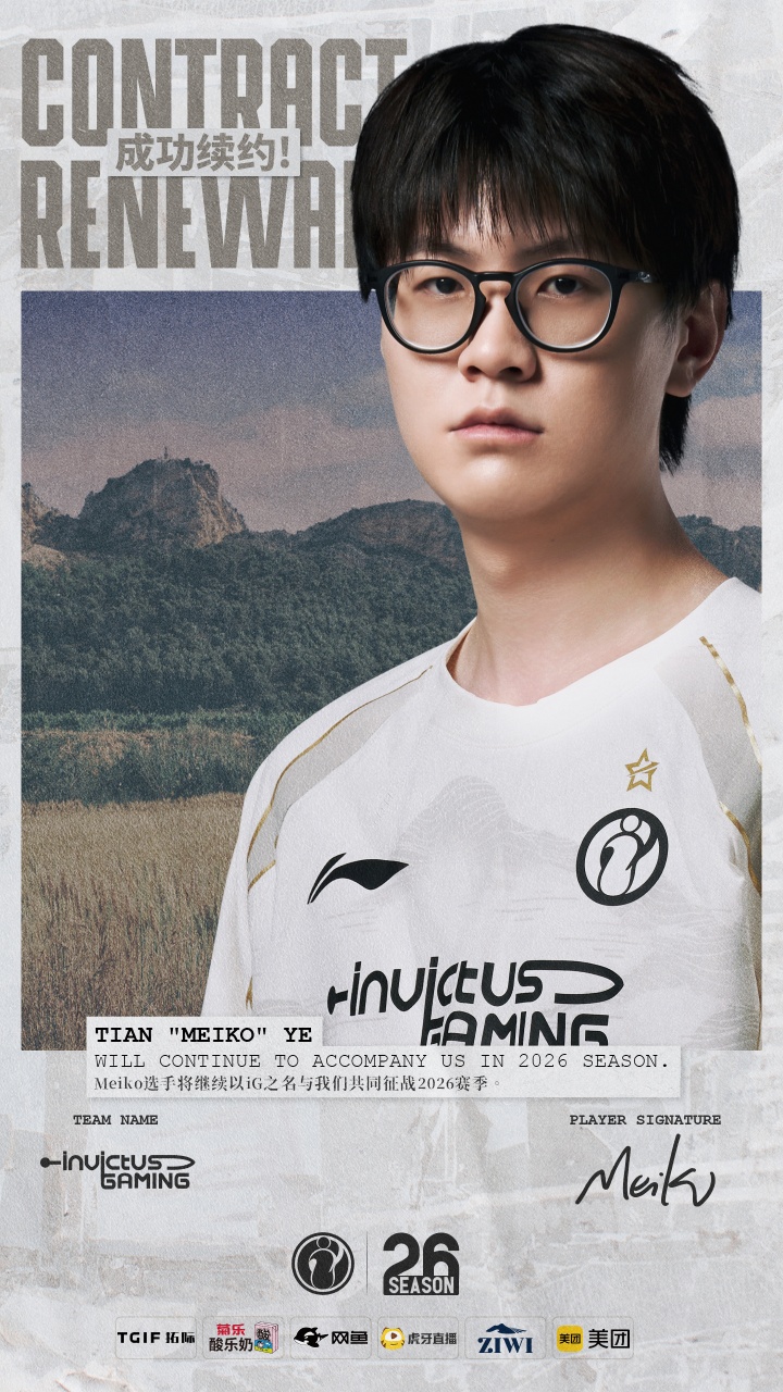 2026赛季将是Meiko在iG的第二年,而来到职业末期的Meiko在今年合同结束后就快29岁了,也不知道Meiko能够再打多久。