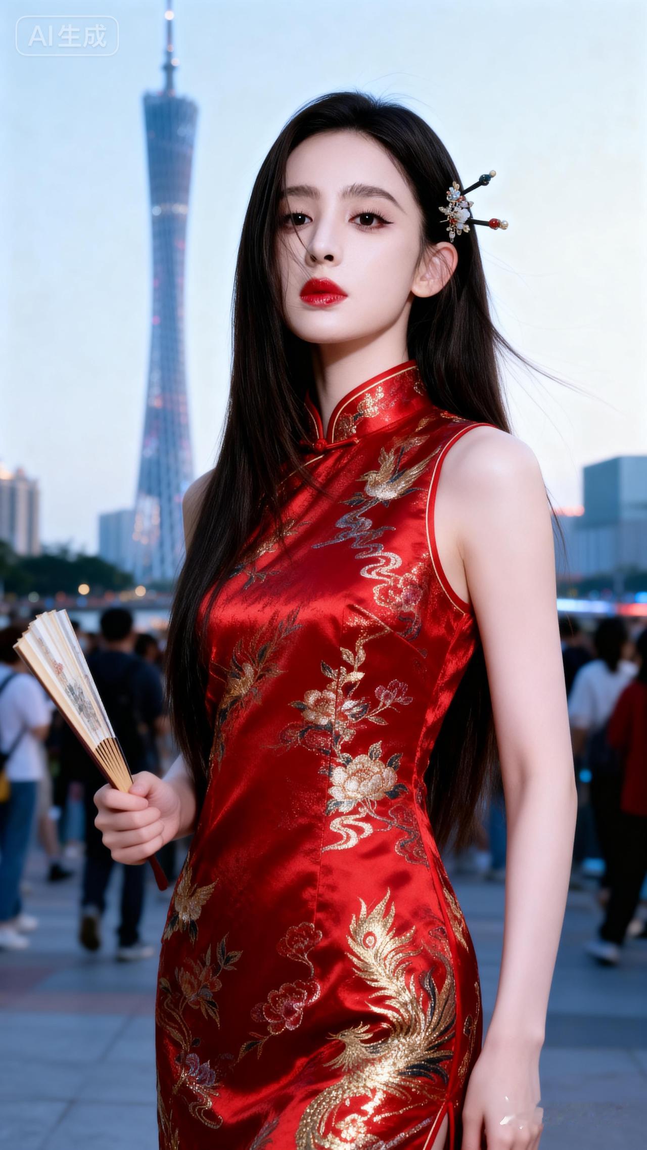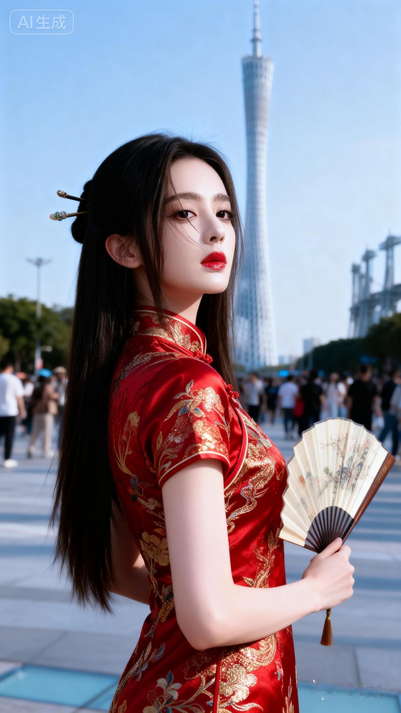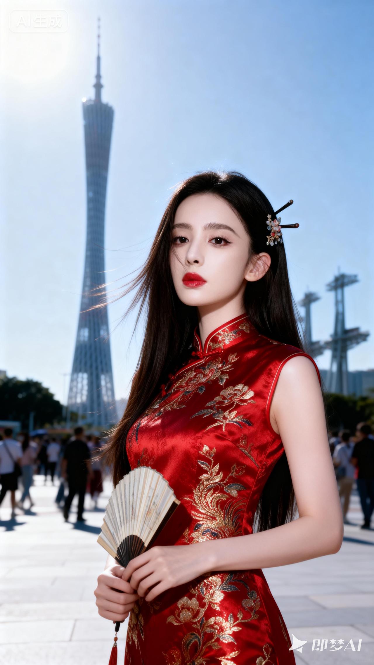 红衣美人手持折扇,背景是现代高楼,古典与现代的完美融合。