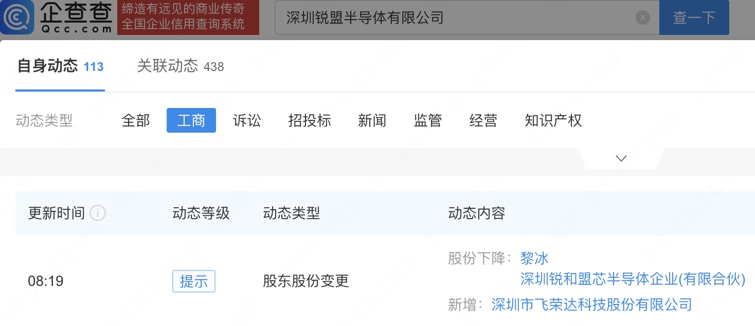 企查查APP显示,近日,深圳锐盟半导体有限公司发生工商变更,新增飞荣达(300602)为股东。企查查信息显示,该公司成立于2020年,经营范围包含集成电路设计、研发、测试、销售及技术咨询等。据其官网,锐盟半导体是一家智能人机界面处理器芯片及解决方案提供商。
