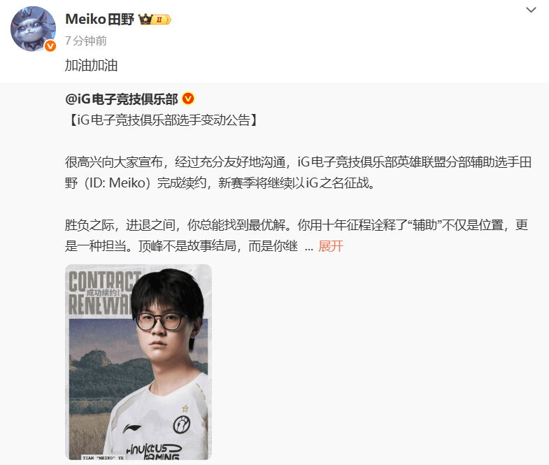 虎扑12月10日讯辅助选手Meiko转评与iG续约公告:加油加油