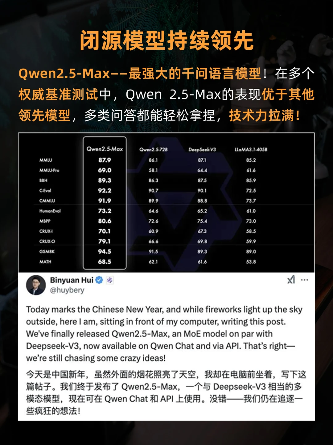 Qwen2.5-Max在多个权威基准测试中,Qwen 2.5-Max的表现均展现了显著的优势,在 Arena-Hard、LiveBench、LiveCodeBench 和 GPQA-Diamond 等基准测试中,Qwen2.5-Max 的表现都超越了 DeepSeek V3。