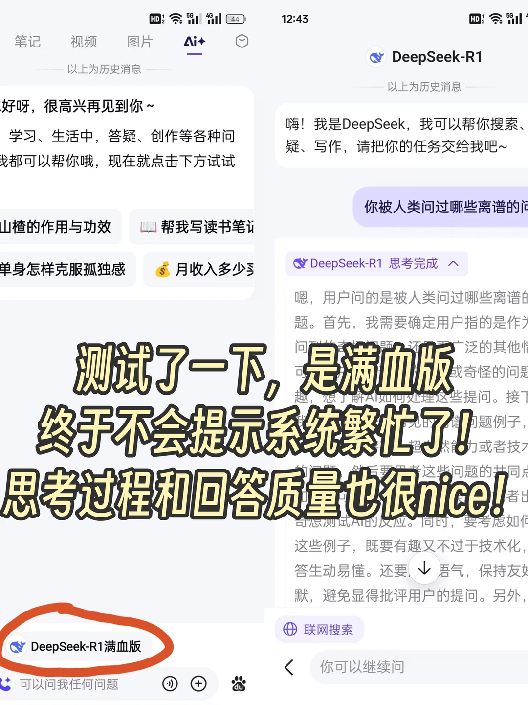 我大致体验了一下,是满血版,不卡顿,不提示繁忙,回答质量也不错,还有搜索也做了优化,不再是满屏的广告满天飞了!