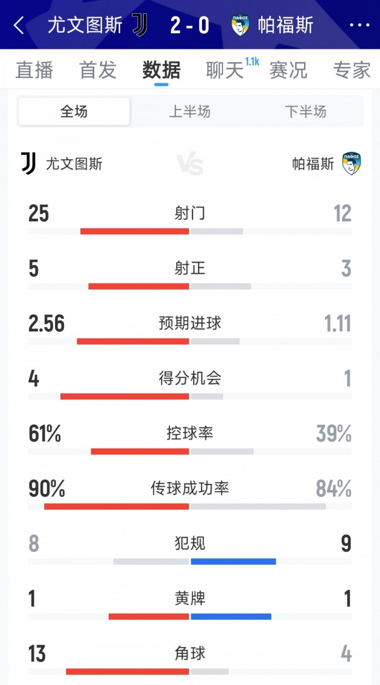 直播吧12月11日讯在本轮欧冠,尤文2-0击败帕福斯,以下为双方全场数据对比: