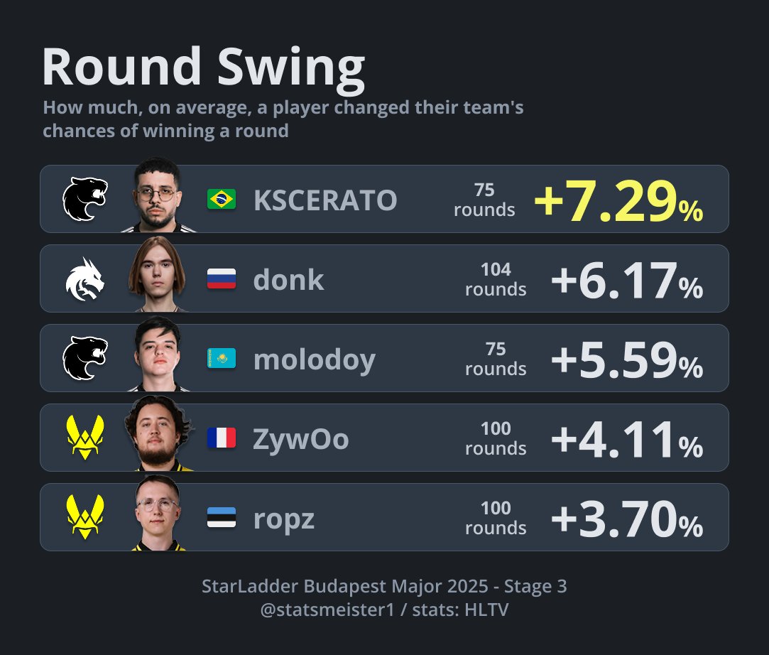 该数据反映了在2025年布达佩斯Major第三阶段的比赛中,顶尖选手通过击杀、道具使用、残局处理等综合表现,持续且显著地提升团队回合胜率的核心价值。