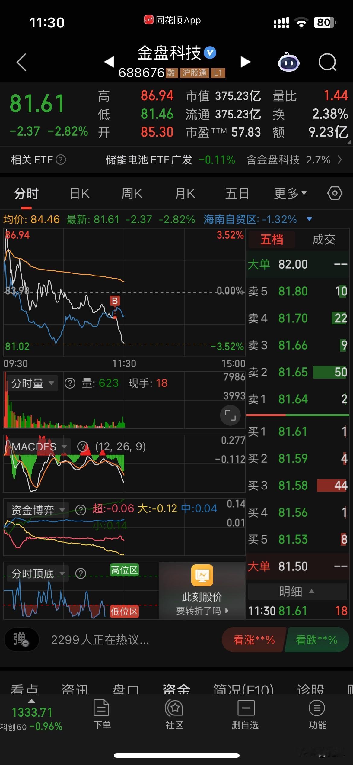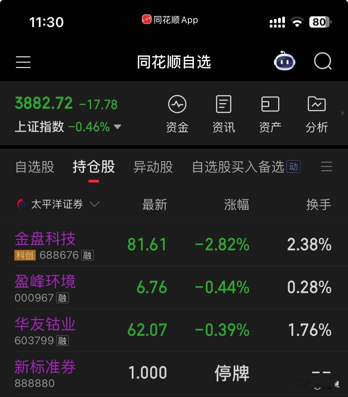 上午大盘弱势下跌。早盘我的股都很强,可惜没有高位卖出。特别是金盘抄底抄在半山腰[