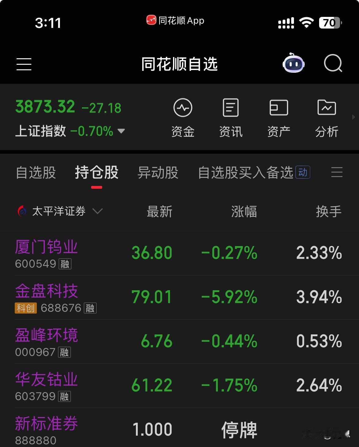 大盘下午继续杀,我的金盘跌惨了,为了控制风险,尾盘把加仓的卖掉了。今天下午出击了厦钨,收盘还好在成本线之上。盈峰还是比较稳没怎么跌。今天大亏近1千8,本月还有2千5的利润。继续保持连续多月的红盘。今天有点冒进,需要总结。我估计明天上午还有惯性下跌。准备低点加仓。