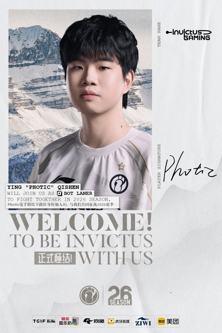 经过与选手的积极沟通以及友好协商后,我们高兴地向大家宣布:即日起,选手应祺燊(ID:Photic)@citohp正式加入iG英雄联盟担任下路位。