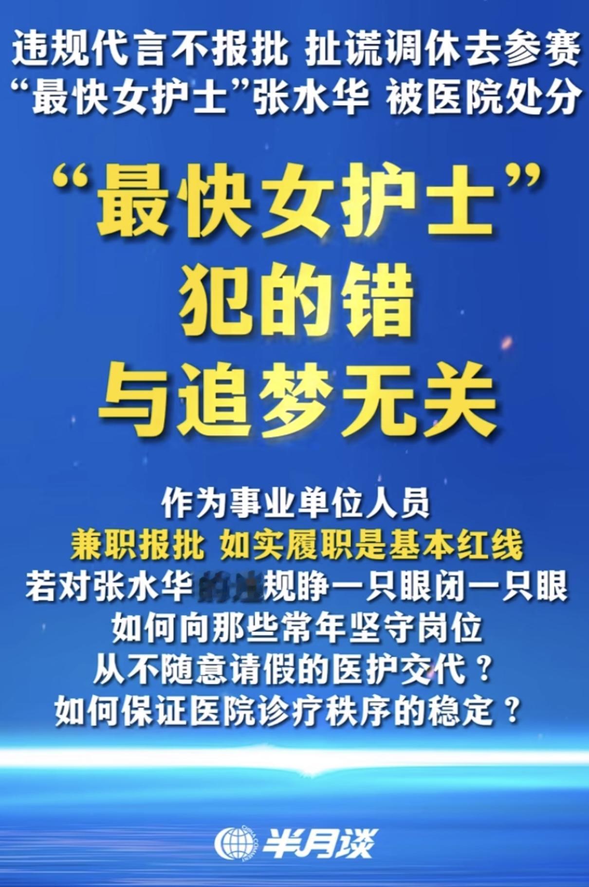 护士界“马拉松一姐”张女士被处分,现在出现了一个特别有趣的局面:张女士一言不发、医院一肚子委屈、评论区为张女士呼吁公平、各大官媒客观指正……作为捧着事业单位铁饭碗的公众人物,张女士有点被带偏了,养家糊口没错但不能以牺牲同事的周末时间成就自己的事业,调班不是调休,公平是互相的,张女士得到了成就而替她上周末班的护士得到的只有无法周末陪家人的无奈。