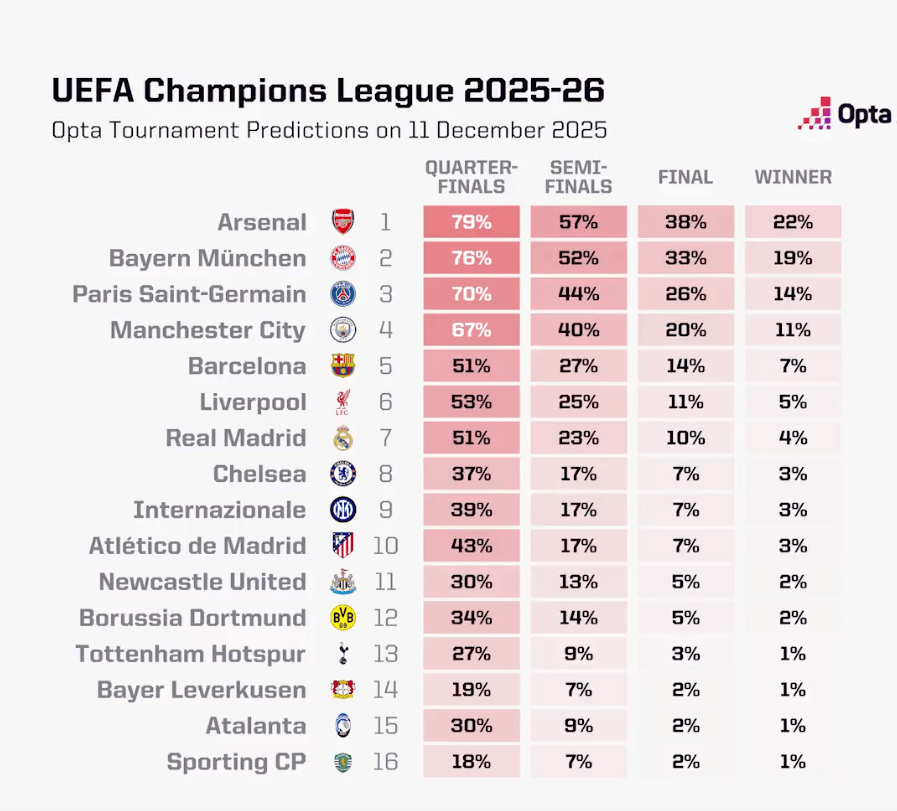 虎扑12月11日讯本赛季欧冠联赛阶段第6轮的比赛以及全部结束,著名统计机构opta也更新了各队欧冠夺冠概率,阿森纳夺冠概率22最高,拜仁、巴黎排在二三位。