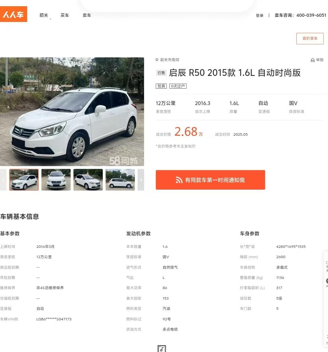 朋友给我发了个截图,他刚刚买了一辆车,手动挡的,目前已经跑了12万km,总共花了1万块钱出头。 我觉得价格还算可以,这车毕竟是15年款的,到现在也没有太多时间,好好收拾一下,再战斗个10年没有什么太大问题。 之所以要买这辆车,是因为他发现了一个很重要的事情。那就是别人都以为新能源车贬值非常快,但他突然发现,原来油车的贬值居然比新能源汽车还要快。 比如说他买的这辆启辰R50手动挡,我大体查了一下,当年手动时尚版的入门版指导价格为6.98万元,手动豪华版则为7.68万元。 至于说其他人买到手的价格,其实在网络上也能查到相关车辆的二手成交报价单,这样一来,自己是不是买亏了,也可以做个参考。 比如在一个二手车网站上,这款车的自动时尚版也是行驶了120000km,最后在今年5月份,以2.68万元的价格成交了。 当然了,手动挡的车型肯定要比自动挡便宜一些的,可是这一下子就便宜出了个1.6万元,也确实是一个大便宜。 我还查到了另外一款2012款的启辰R50,也是一个手动挡的。虽然说它的标价为8800块钱,但这车的车龄实在是太长了,而且距离朋友居住的地方也比较远,根本就不可能跑到那边去提车,所以最后这款车也算pass了。 这辆车本来我是想和第一辆车一样截图的,结果发现在写文章想要截图的时候,图片已经找不到了,也不知道是为什么,就只能放弃了。 还有一辆是2013款的,2014年上的牌子,也是跑了12.54万km,人家的报价是1.75万元,结果想截图的时候也是发现车辆信息不存在了,但价格肯定是真实的。 所以大家算算就明白了,我哥们那辆跑了10年的车,以1.066万元的价格买下来,绝对是性价比非常高的。你要是买二手电动车,恐怕拿不到这么好的价格。 最后只需要注意一点就行,就是要让二手车贩子必须要确认,这车没有任何大事故,也没有水泡过。如果他不敢签字,那就肯定是假的,肯定有问题,我们不买就行了。【来自懂车帝车友圈】