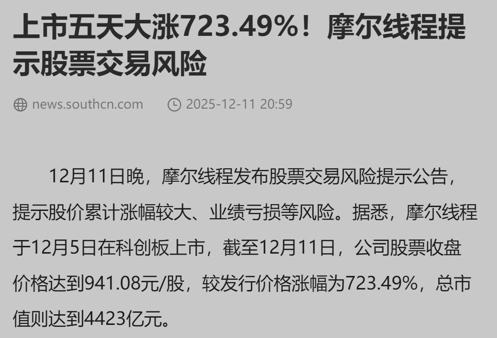【收盘后,摩尔线程提示风险】摩尔线程风险提示的市场影响分析 短期调整压力:公司主动提示风险可能引发部分资金获利了结,尤其在近期股价连续大涨后,市场情绪敏感,技术性回调概率较高。A股市场对概念炒作监管趋严,类似公告易成为空头催化剂。 长期分化逻辑:若后续研发进度或量产时间表不及预期,股价可能持续承压;反之,若技术突破得到验证,调整后或吸引长期资金。当前市场对国产GPU替代预期强烈,但需区分概念炒作与真实业绩拐点。 板块传导效应:作为国产算力概念标杆,其波动可能影响半导体、AI硬件相关个股,尤其依赖“故事驱动”的高估值标的。投资者将更关注技术落地与订单兑现能力,概念普涨阶段或结束。 市场反应料分三阶段:公告后抛售→观望等待技术信号→依据研发进展重新定价。理性投资者需警惕流动性推动的估值泡沫。