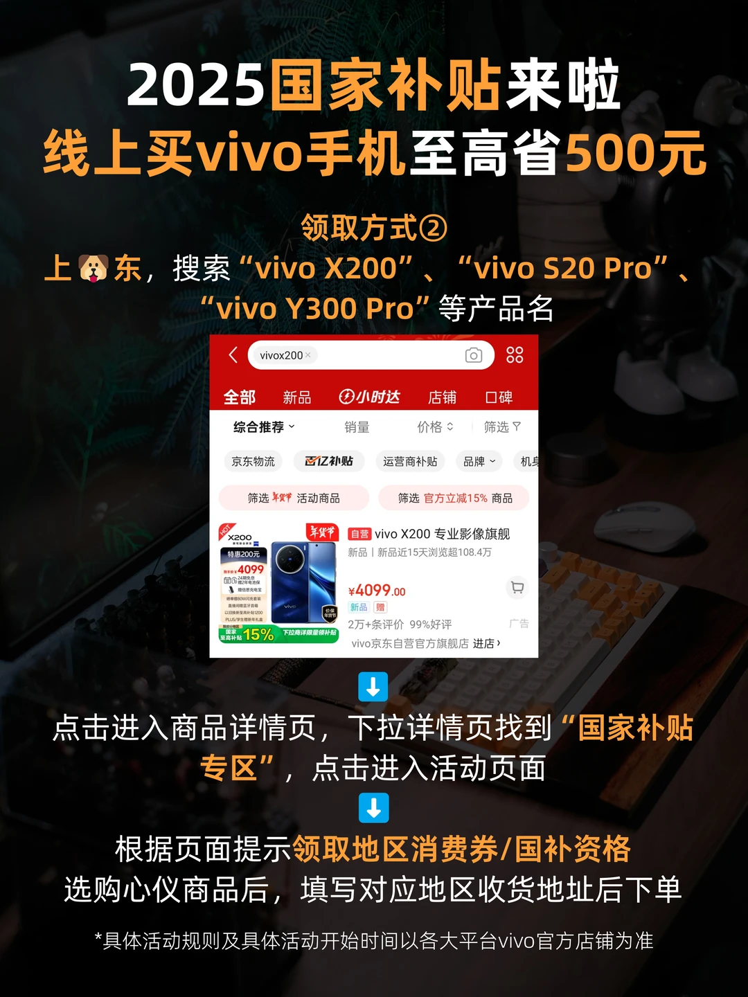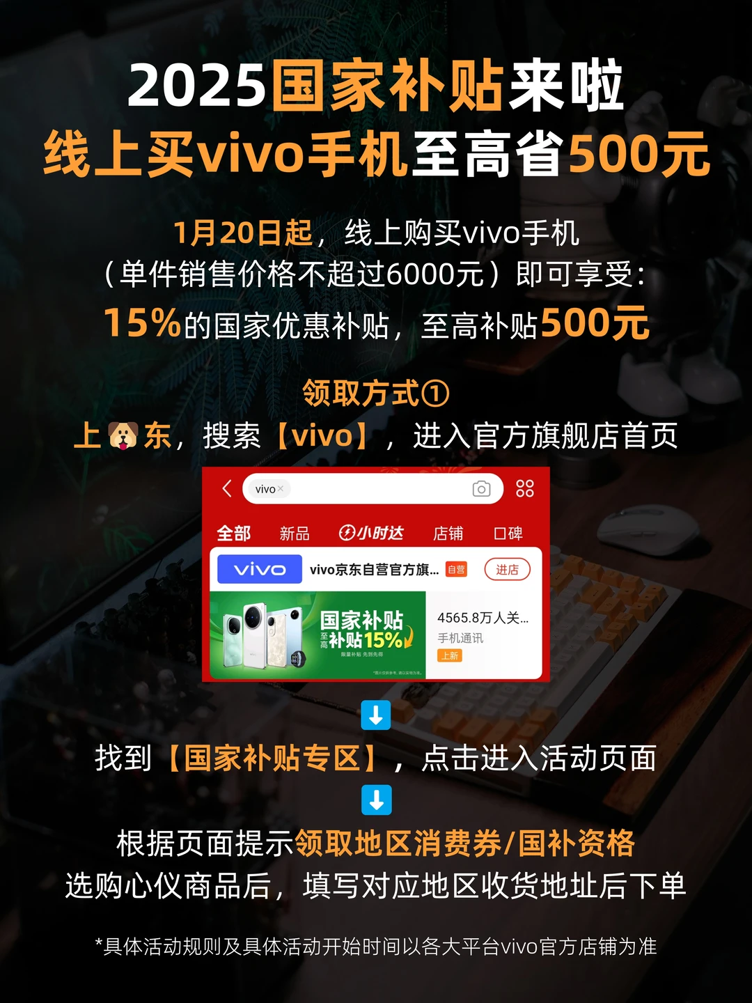 1月20日,国家补贴正式上线,线上购买vivo产品即可享受15%的国家优惠补贴,至高可享500元优惠,补贴力度相当之大!!
