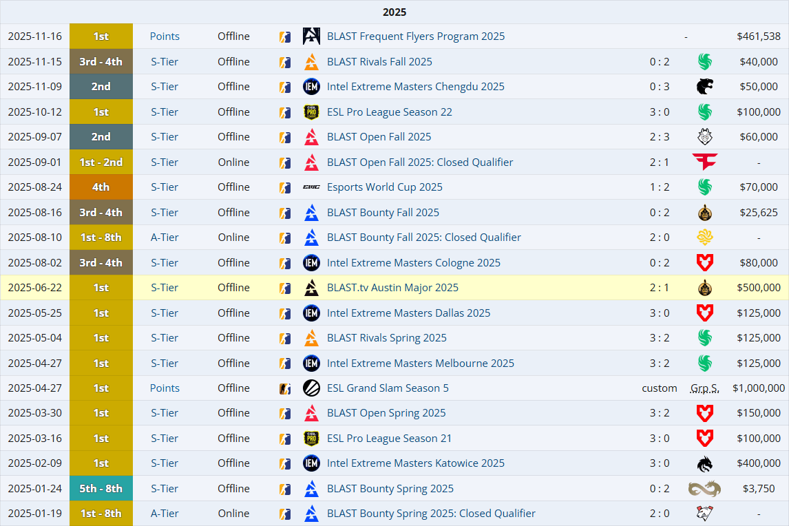 至此,Vitalitiy今年在他们参加的全部16项S级线下大赛当中,除了年初的BLAST赏金赛S1止步八强以外,后面连续15场大赛全部至少打进四强阶段,最差战绩仅为EWC电竞世界杯殿军。