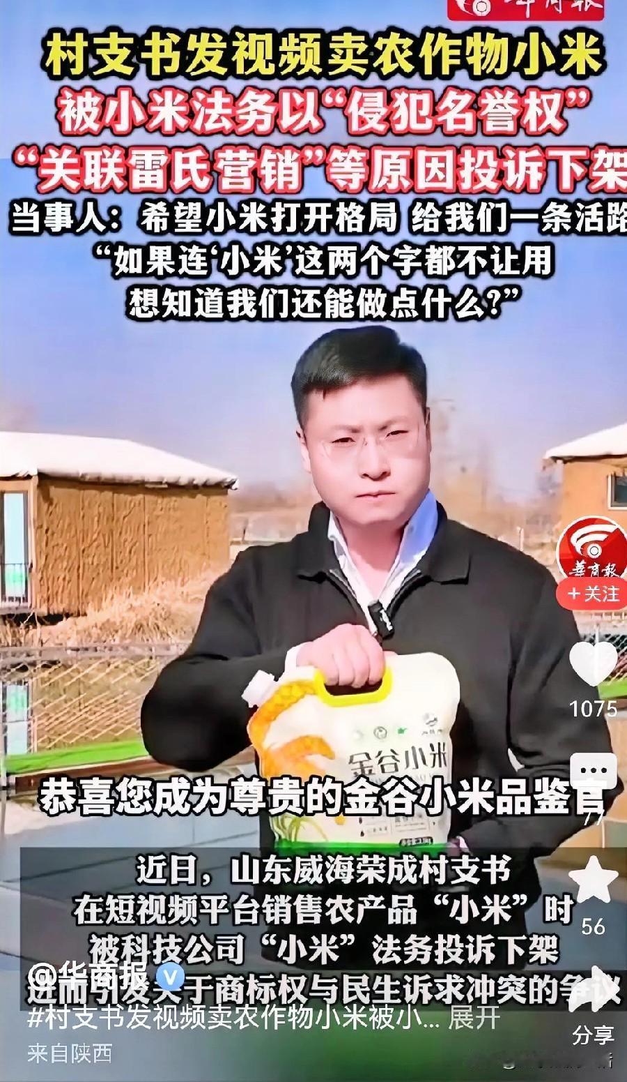看完山东这个村支书的结局,很多打开了致富的新途径。 今天名字可以投诉不让你用,以后是不是也有可能这两个字都不允许出现在任何地方了,一个种植了几千年的作物,难道因为注册了商标就成为一个的专属定制。 想发财的朋友专家去注册商标和专利吧,把玉米、大豆、花生、高粱、地瓜、小麦等等所有农作物都给注册了,以后但凡有人用这些词语,你就可以收取授权费用,就连以后写文章,只要有这个词语,没经过你的允许,你就能投诉他侵权。 以后市面上的玉米胚芽油可能就变成了爆米花油,大豆油就变成小金豆油,花生油就变成了果子油。而高粱酒也不再是高粱酒,地瓜干也将不是地瓜干。 这一样搞,比当年乾隆时期的文字狱还要入木三分,这些农作物不但不能写,可能也不能直呼其名了。 另外那些优秀的案例,出色的营销方式,也不能去模仿和学习了,因为人家也是有产权的,所有的东西以后只能自创,不能学习,更不能模仿和创越,那么我们那么多的文化遗产也都变成一张废纸,只能看,不能学,更不能用。 优秀的人和优秀的案例,能够被人模仿和学习,本身也是对其的一种认可,不知道什么时候就变成了侮辱诽谤的意思了,真是天下之大,无奇不有啊! 这波操作,估计他家老板都懵了吧!